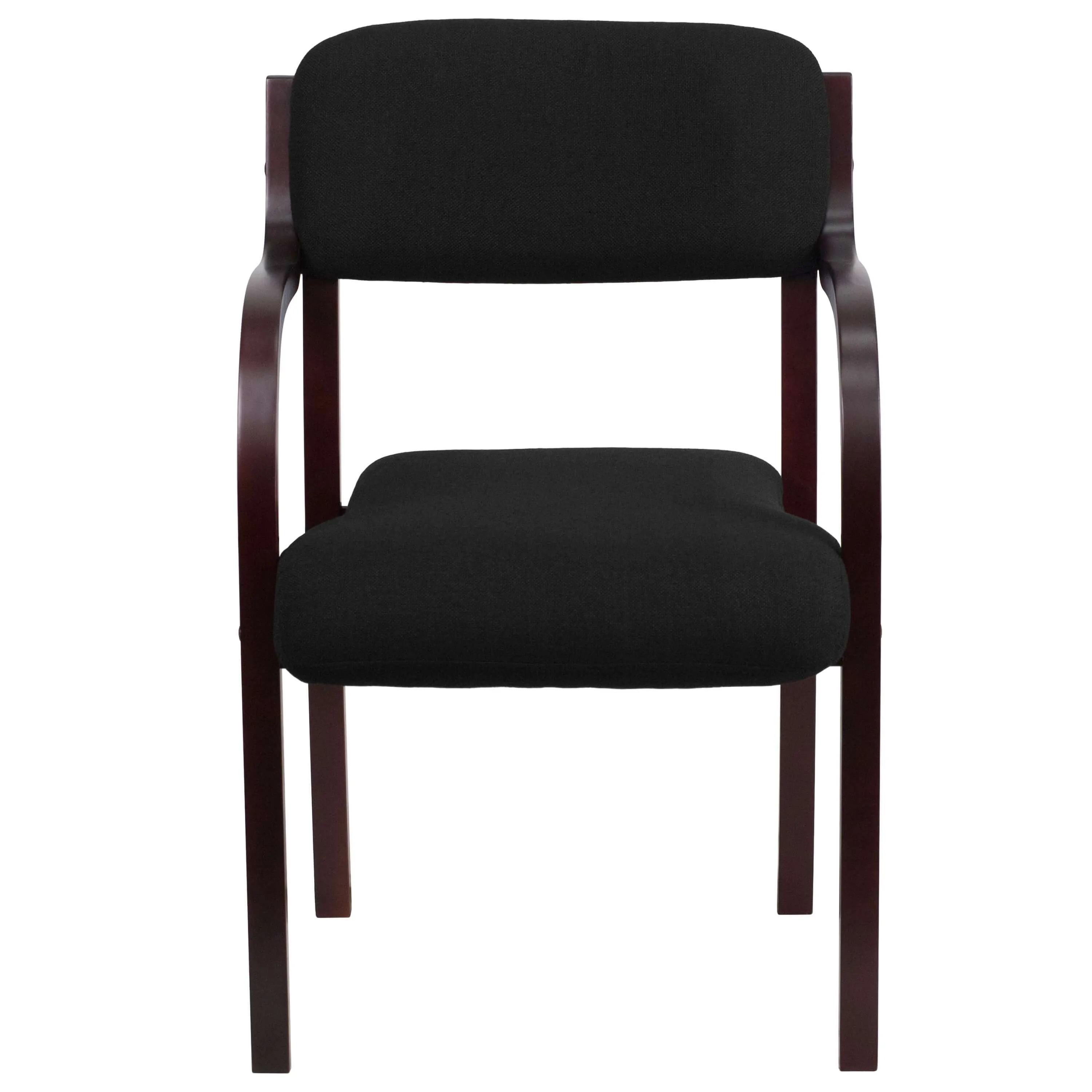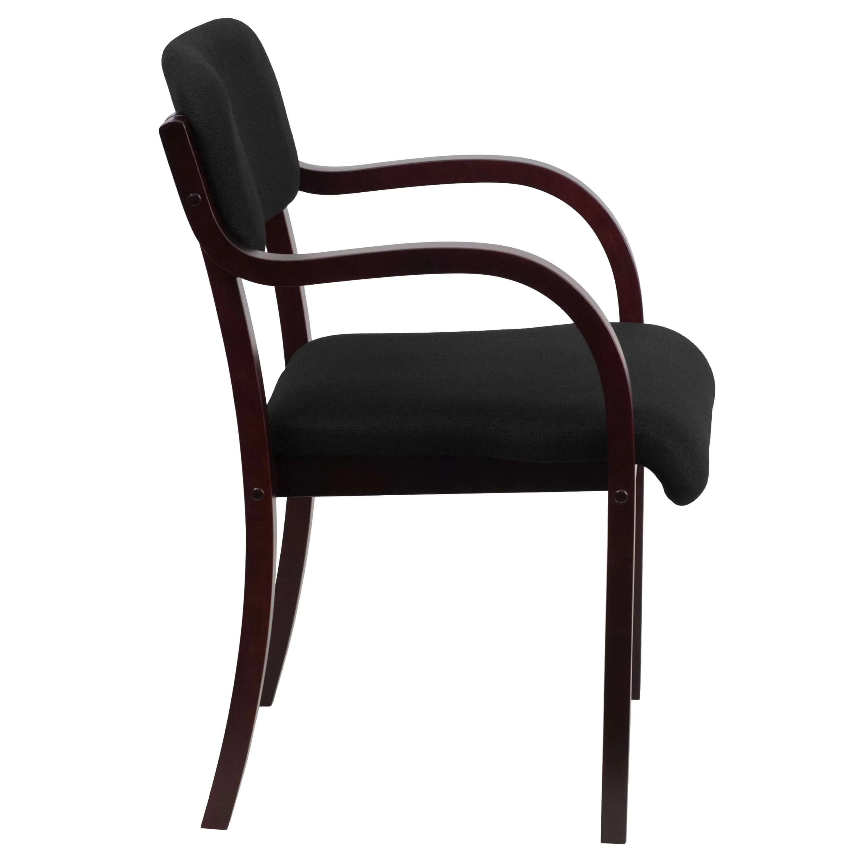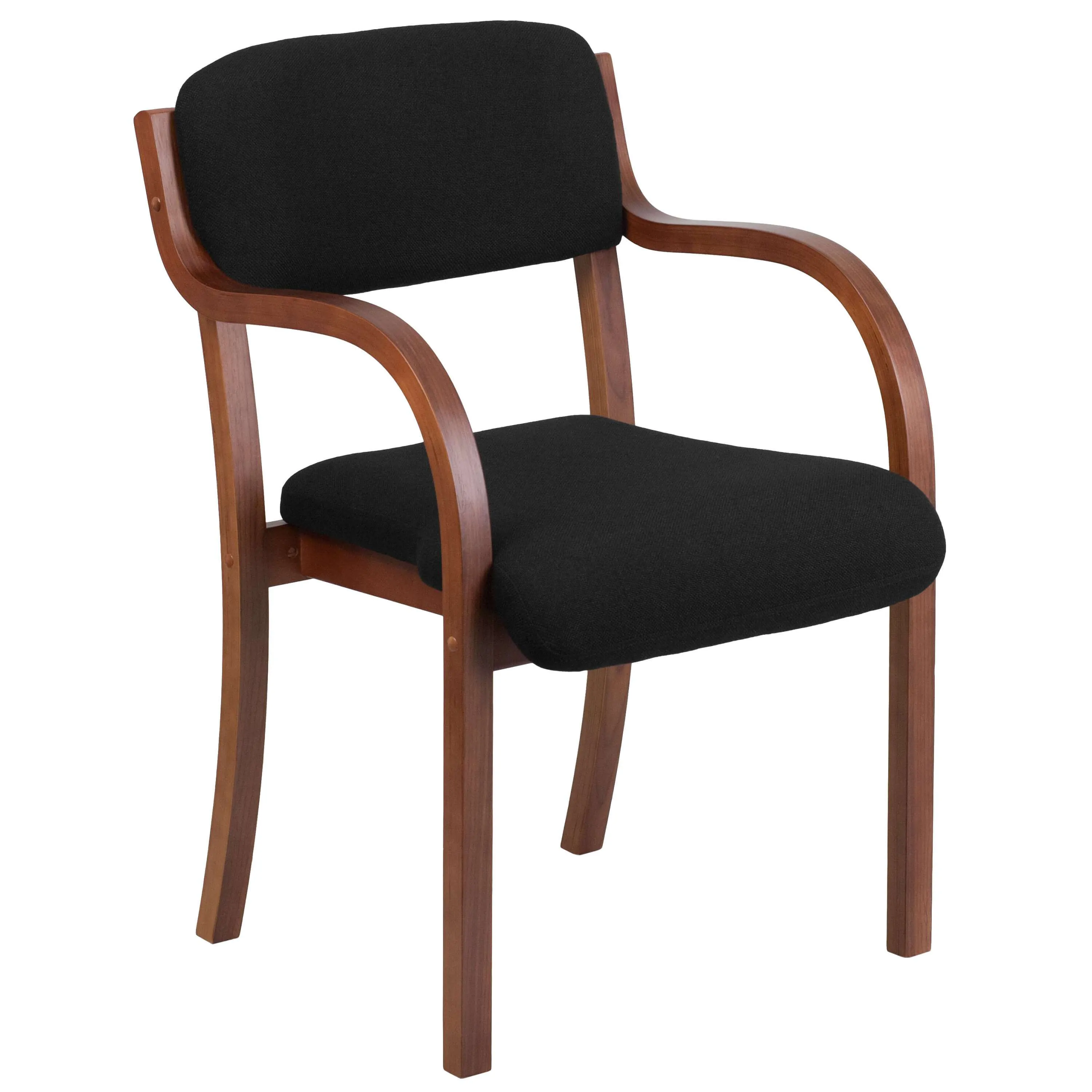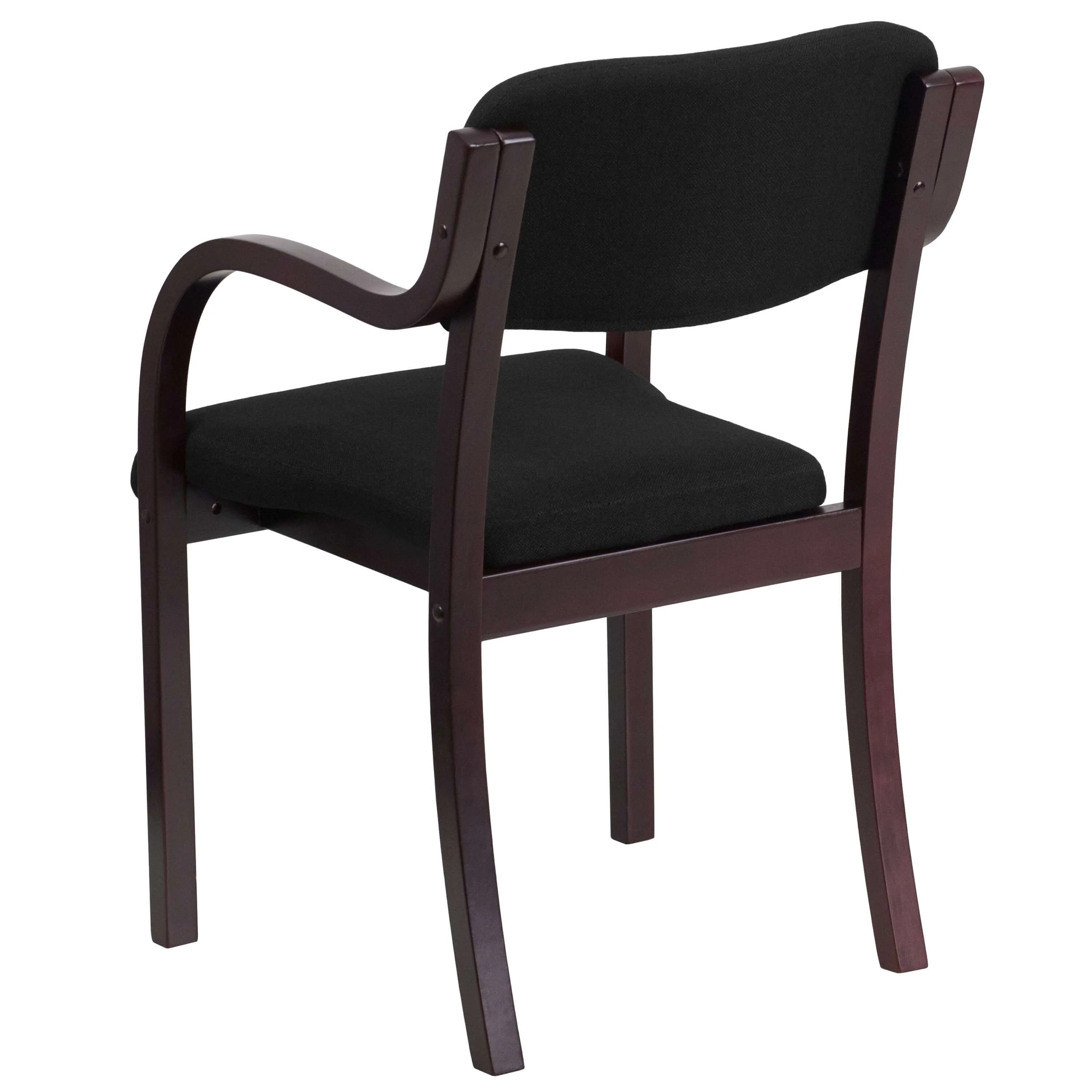 These side chair with arms have upholstery made of black fabric and solid hardwood frame. The hardwood frame is available in two colors: Mahogany and Walnut.