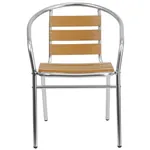 These outdoor patio chairs have aluminum frame, triple slat faux teak back, integrated аrms and cross braces. They are available in one color: Aluminum