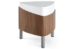 The coffee table triangle shaped design is available in a River Cherry base with white top.