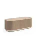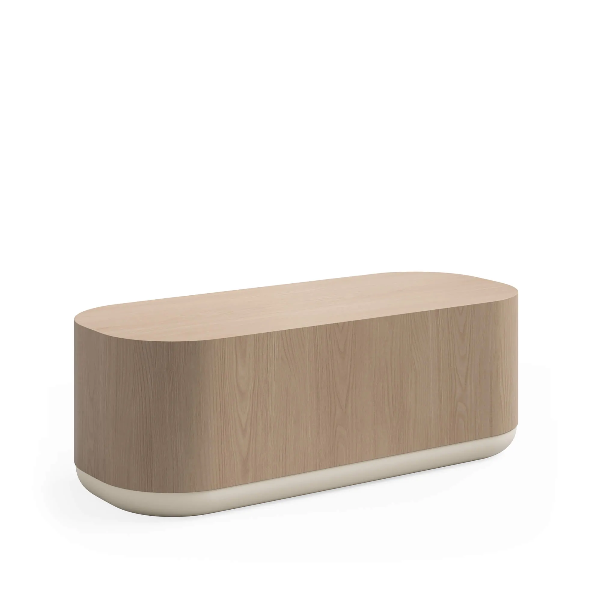 This curved edge coffee table comes standard in a White Oak on Ash veneer top and body a Matte Cotton colored plinth.