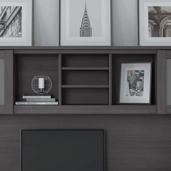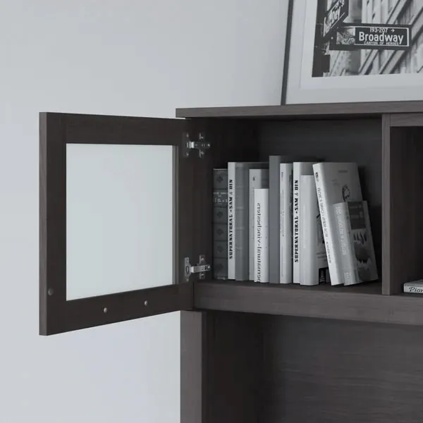 Hutch features open compartments and closed storage areas with frosted glass doors.