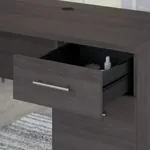 L Shaped Desk offers box and file drawers in addition to a vertical storage compartment.