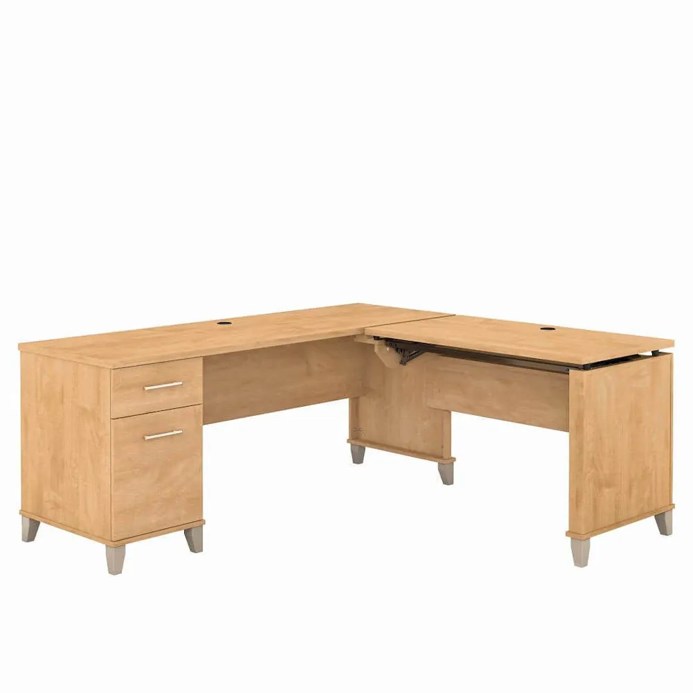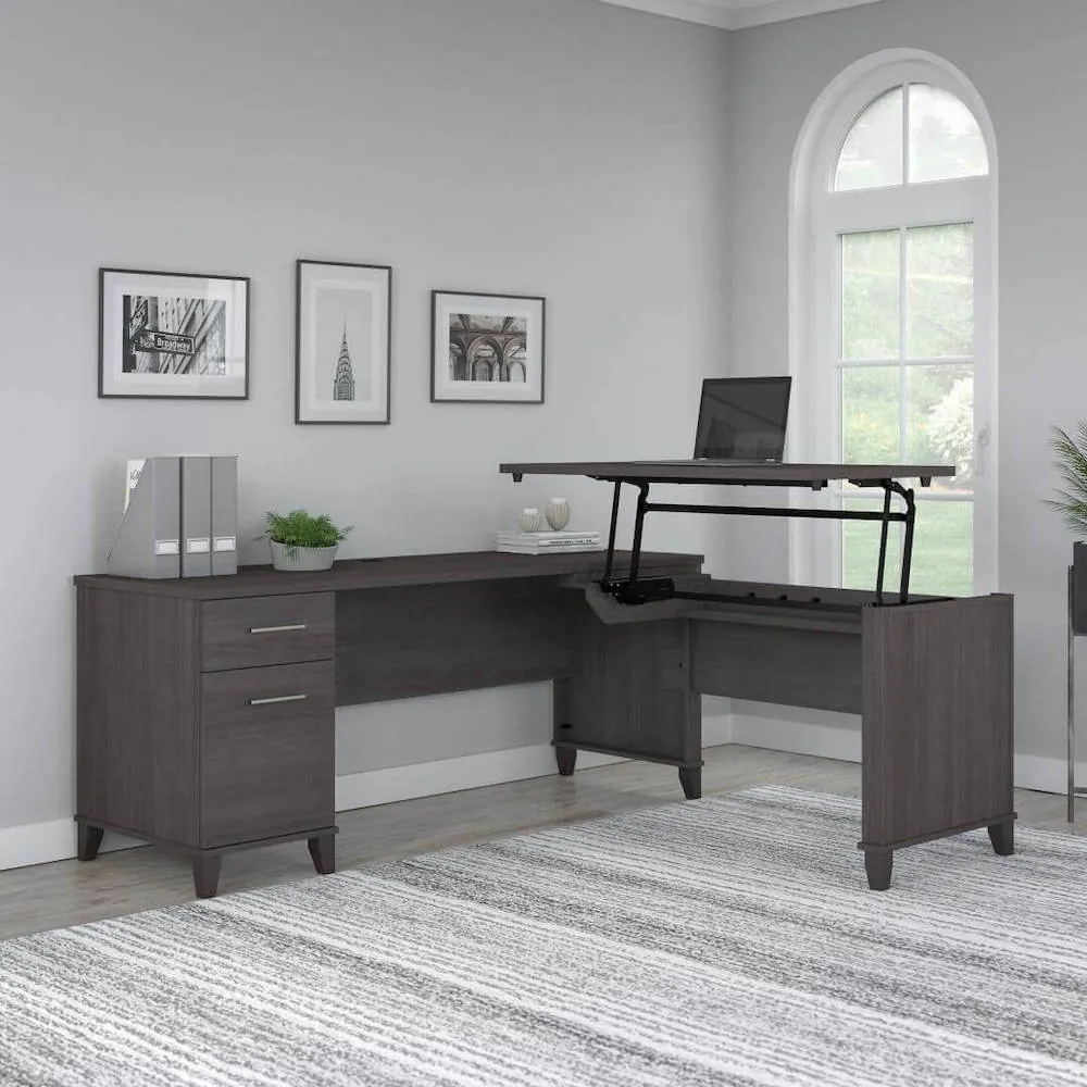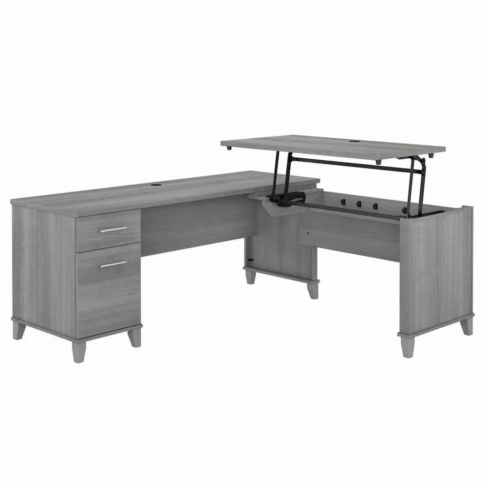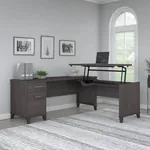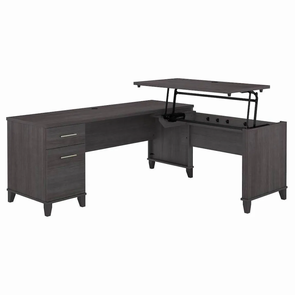With a large writing surface, this L shaped height-adjustable desk is a great option for any workplace or home office. This desk's timeless style allows it to blend in with many other kinds of workstations. It also makes for a very useful and reasonably priced adjustable height desk that can be positioned at three different heights.