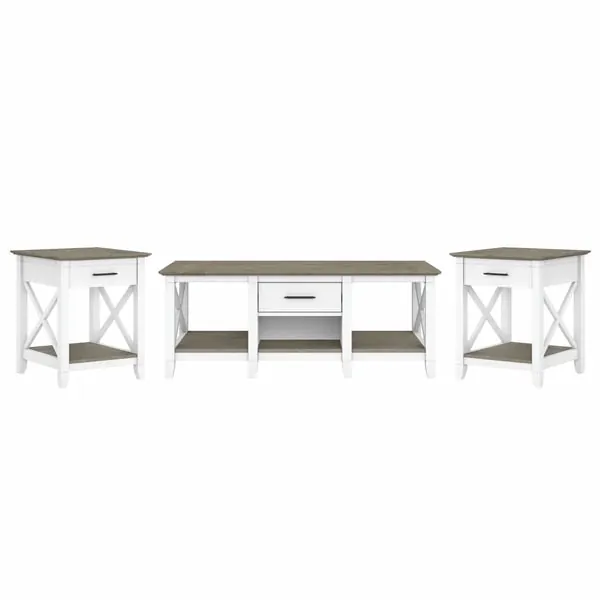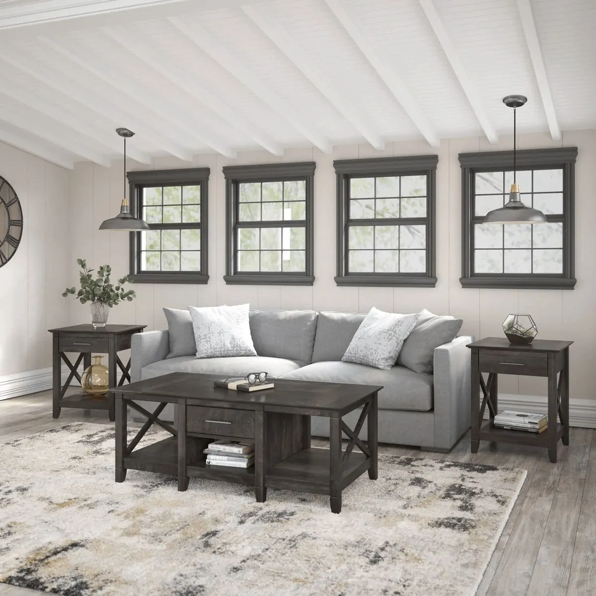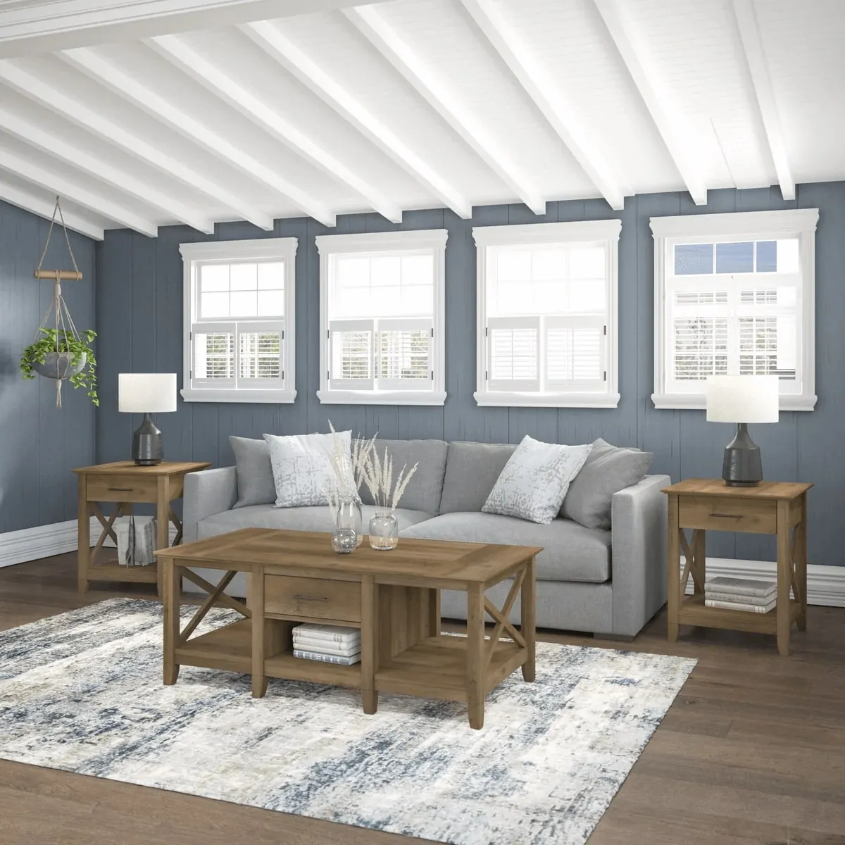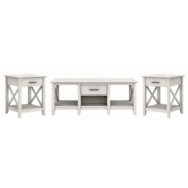 This Coffee Table with Set Of Two End Tables is the ideal piece to instantly transport your living area to a beachside hideaway. Highlighted by its unique X pattern embellishments and your choice of many casual finishes, this little side table is a natural match in homes that embrace cottage and farmhouse decor. While the lowest shelf is ideal for holding reading materials and other home things, a box drawer keeps writing utensils, notepads, TV remotes, and more organized. The surface provides ample space for a lamp, plant, or other personal touches to your design.