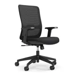 This chair is available in a black fabric upholstered seat with black mesh backrest. The all-black finish is carries through to the black chair base and armrests.
