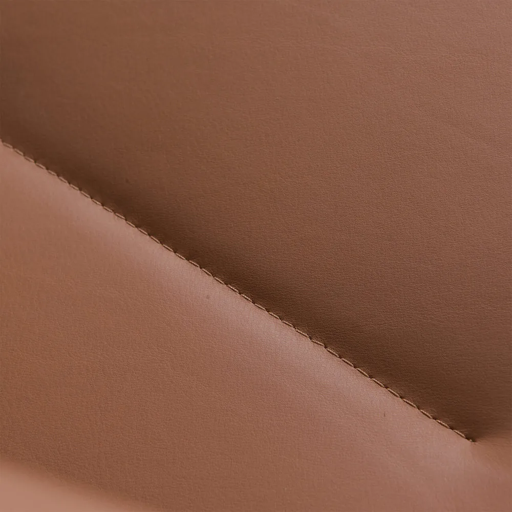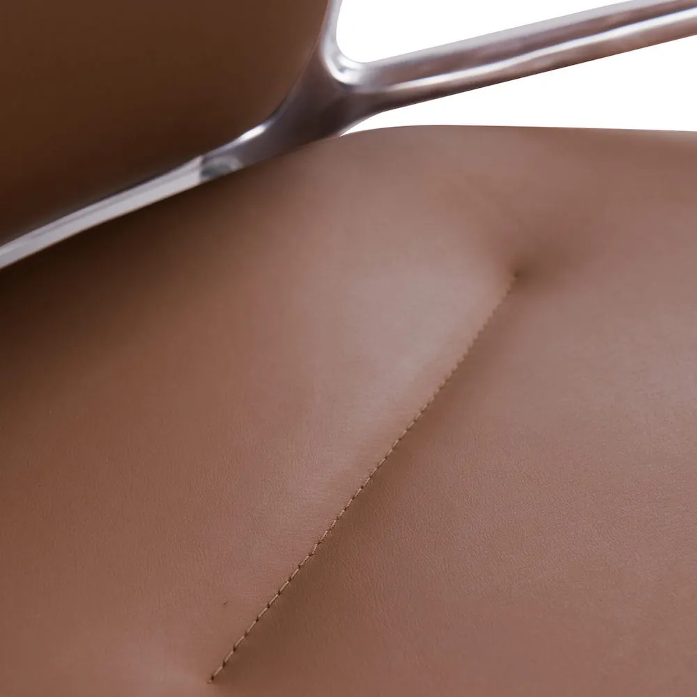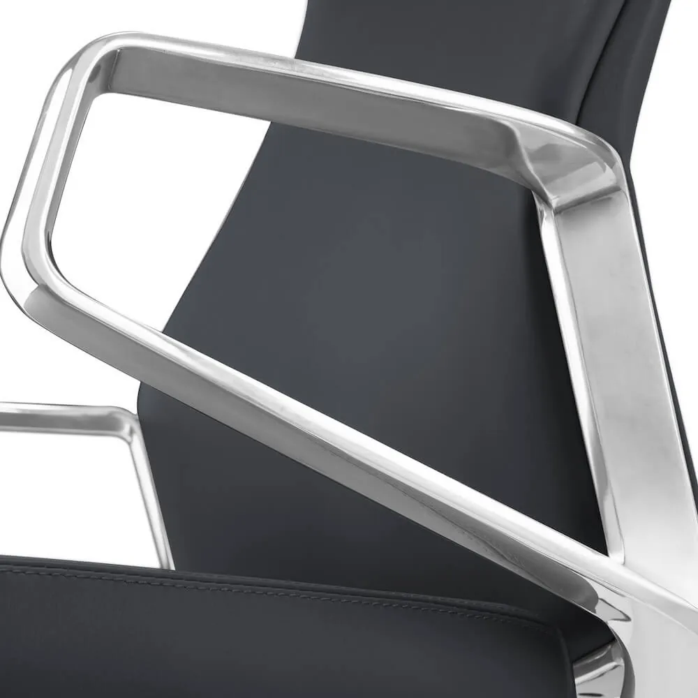 This chair is available in a caramel, gray and black microfiber polyurethane cover on the backrest and seating. The polished aluminum base and fixed aluminum armrest adds a sense of glitz.
