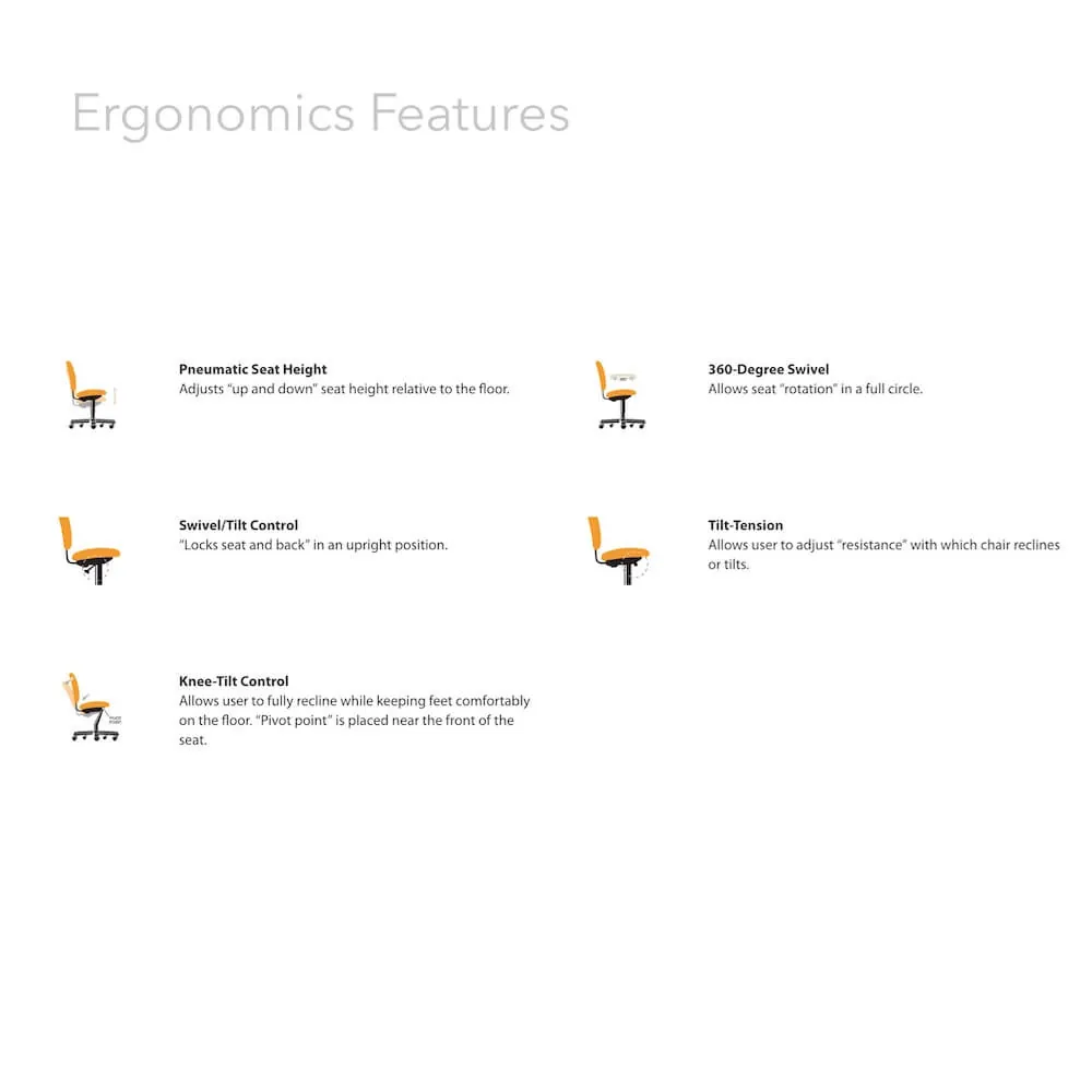 • Knee-Tilt Control, allows user to fully recline while keeeping feet comfortably on the floor. "Pivot point" is placed near the front of the seat.