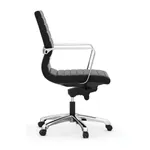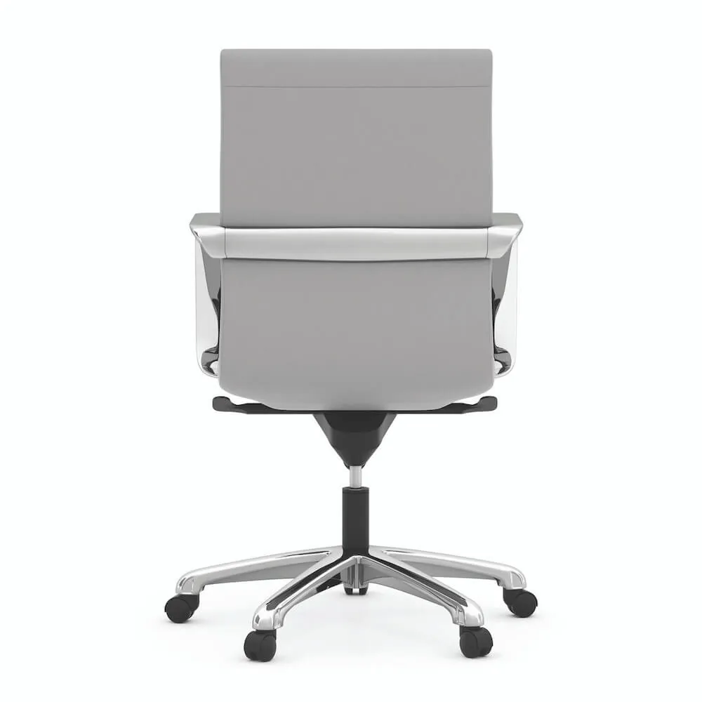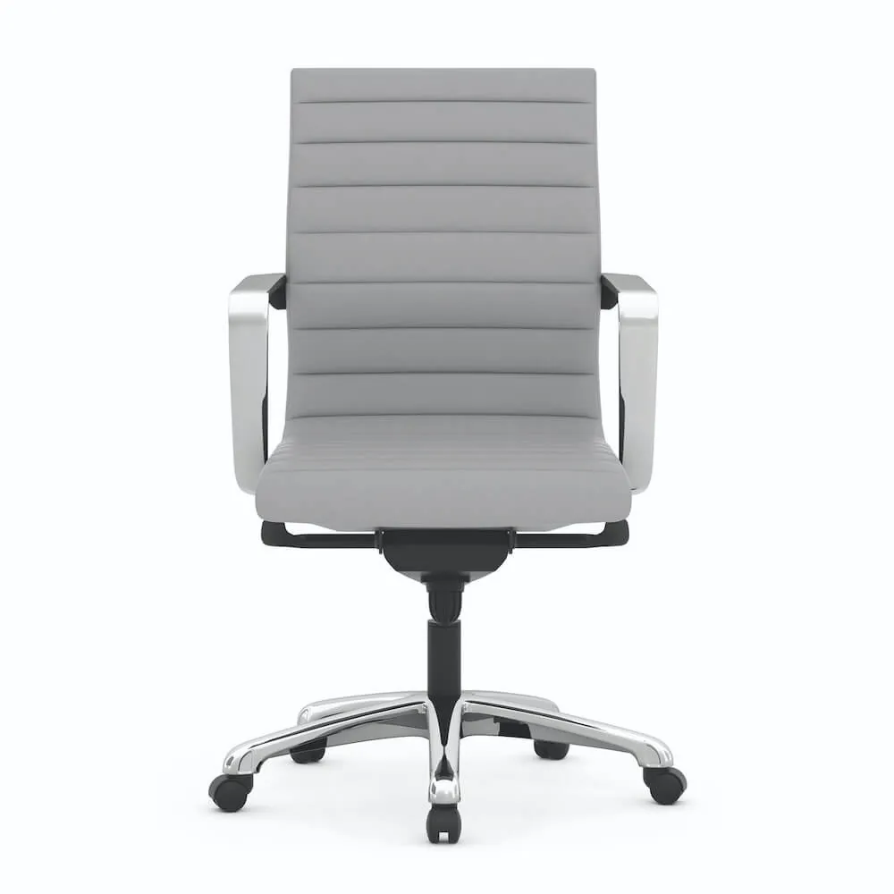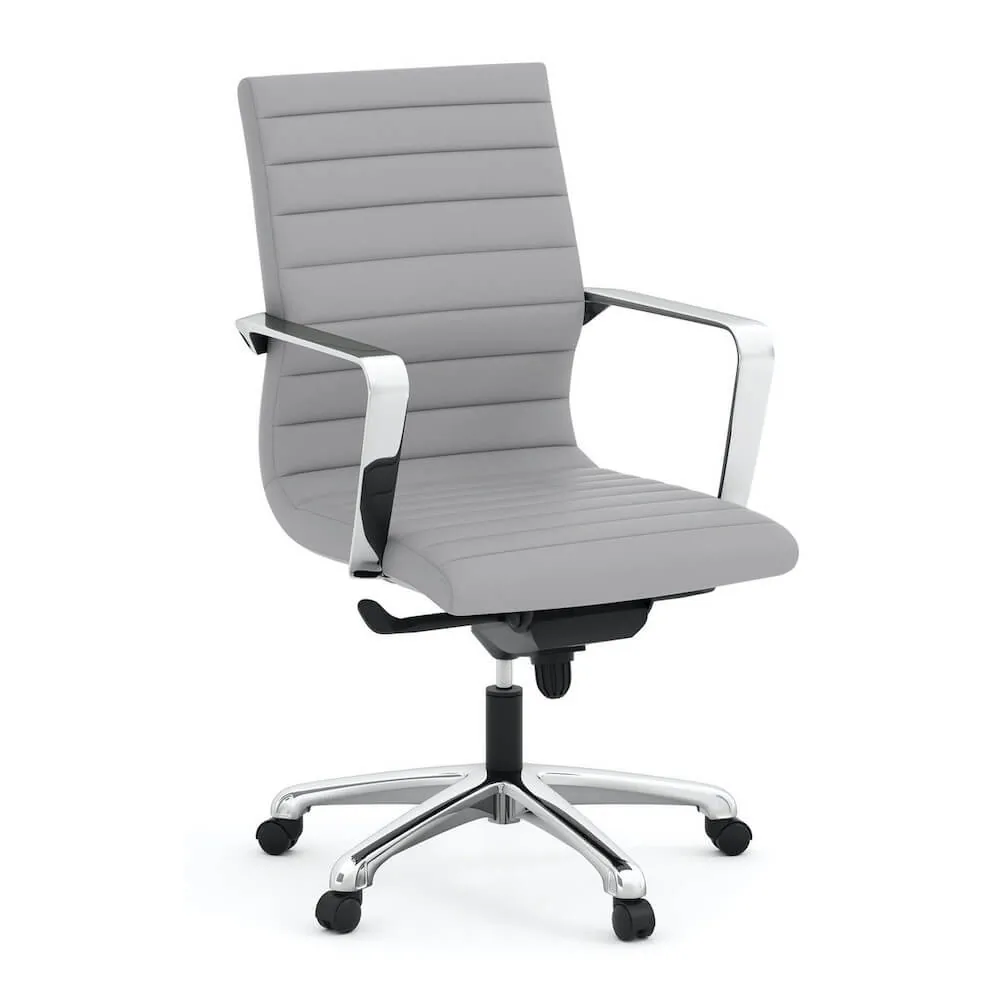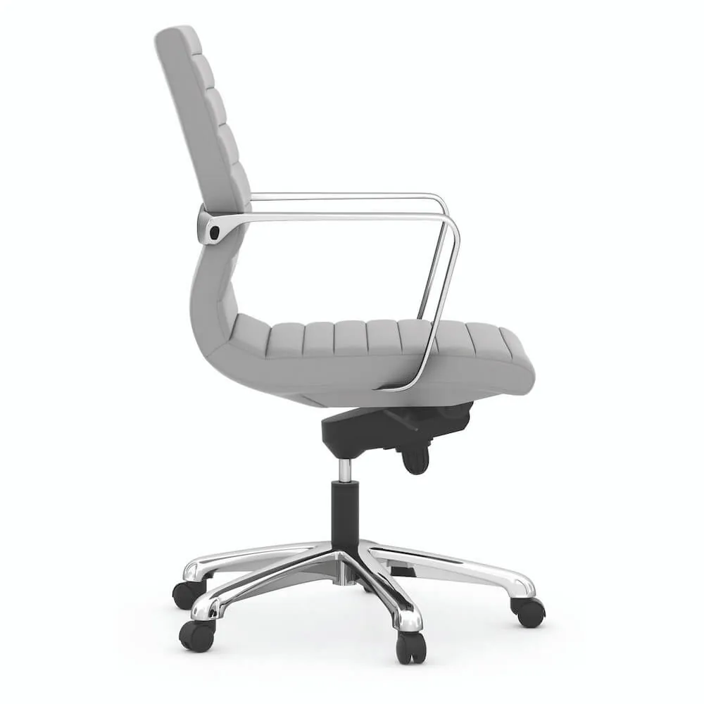 This executive mid-back chair is available in two color options: black or light gray antimicrobial PU leather upholstery for the back and seat. It features a chrome base and frame, polished aluminum arms, and black dual-wheel casters for smooth mobility.