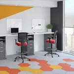 The tall drafting stool is a versatile and practical chair, featuring a mesh back and fabric-covered seat options. This colorful and ergonomic seating solution is ideal for incorporating into your sit and stand workstation or use as a counter stool. With a mixable color selection, it offers attention-grabbing aesthetics that enhance the visual appeal of any office. Key features include ideal dimensions for various tasks, and a multi-function adjustment capabiliy customizable for individual comfort and support needs. Its flexibility provides a personalized seating experience, making this drafting stool with wheels an exceptional choice for nay professional work environment.