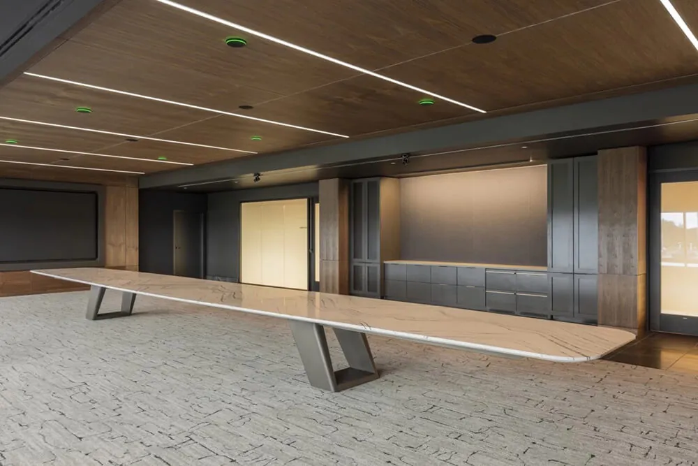 This high end conference table comes standard with an Aged Ash conference table top with a set of dark grey, Medium Tone painted conference table bases and support frame. To see all of the available finishes click HERE.