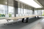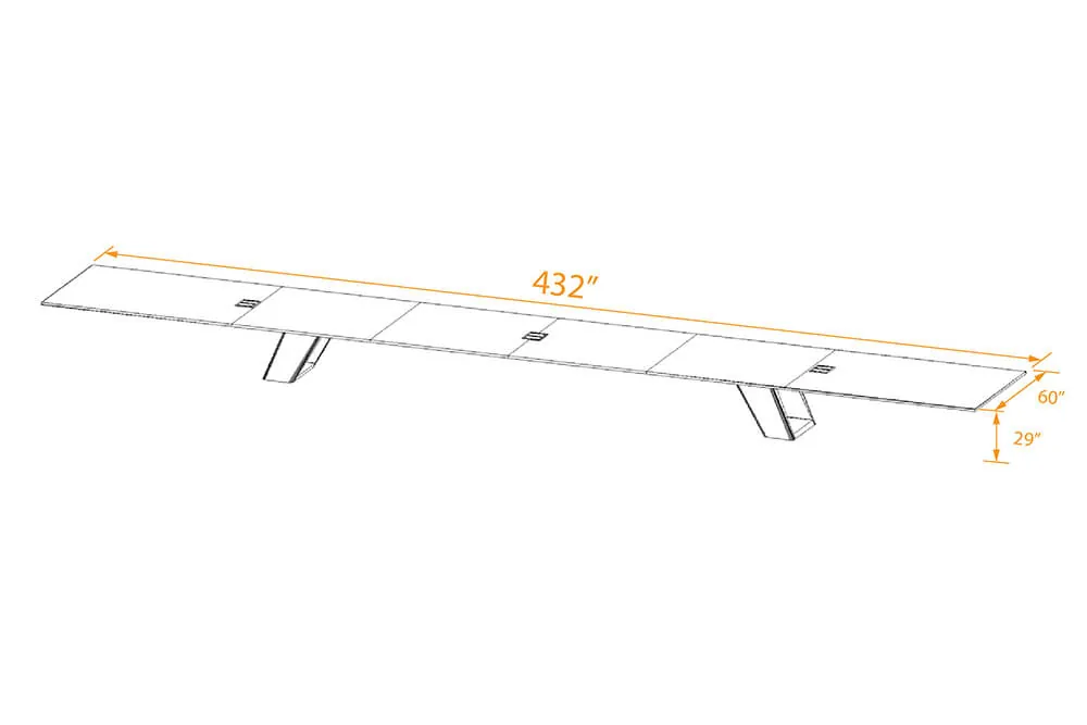 One of the standout features of this large modern conference table is the integrated power system, seamlessly incorporated into the angled table legs for convenient access to outlets and connectivity. This thoughtful detail ensures the table supports modern technology needs, allowing users to power devices without cluttering the workspace. Designed specifically for a large conference room size, this table with its expansive surface and ergonomic design, not only contributes to enhanced productivity but also adds a refined touch to any professional setting. This table is a true blend of innovation and elegance, perfect for fostering creativity and collaboration.