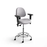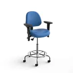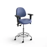 This adjustable lab stool features an upholstered seat and back available in fourfabric color options: Black, Bright Blue, Navy Blue, and Light Grey. It also boasts a chrome frame, tubular chrome structure, chrome footring, black armrests, and black wheels.