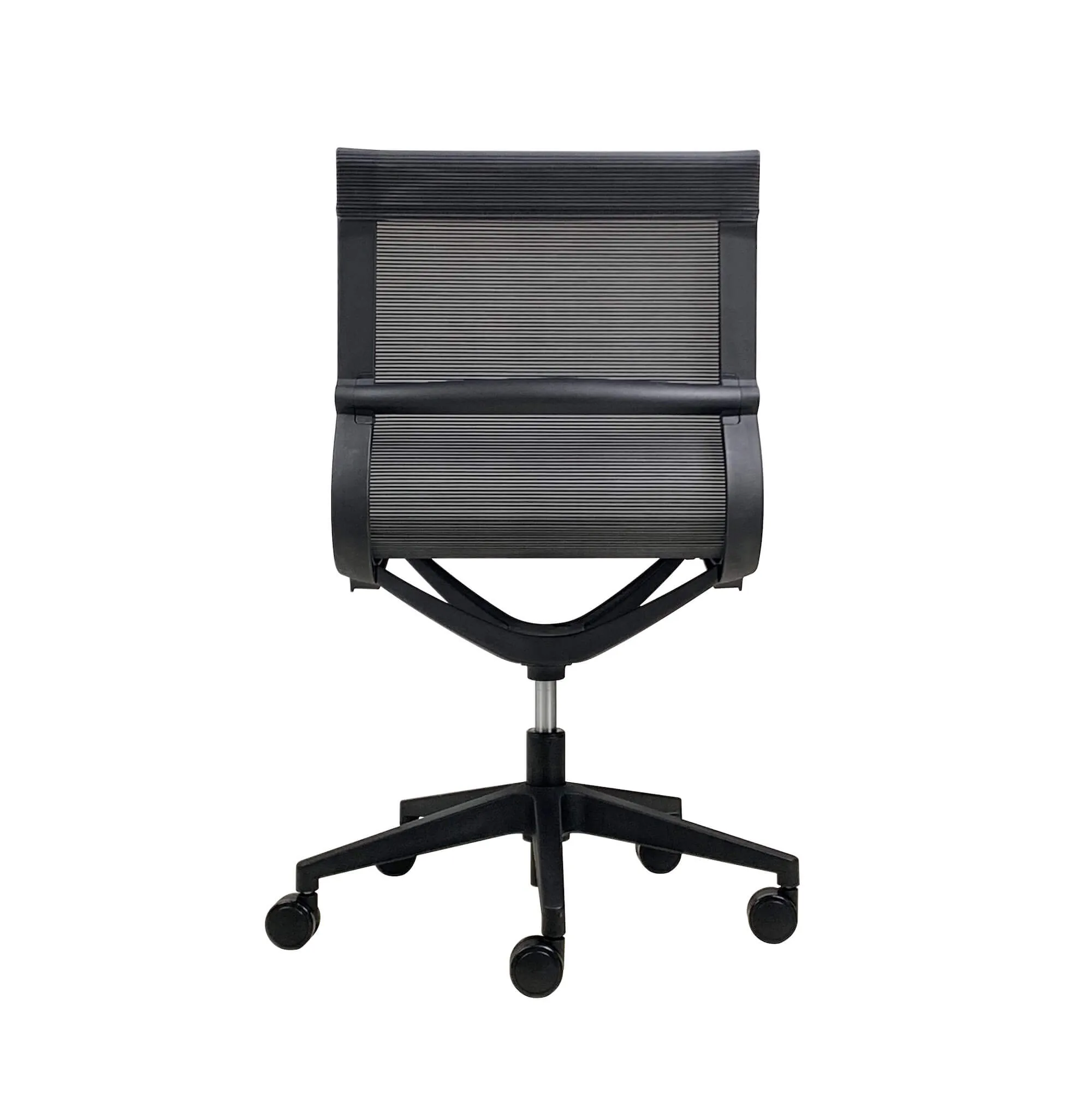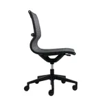 This chair is available in an all-black structure and base. The backrest and seat are combined in a single unit, with a soft curve all made in a one piece of black mesh fabric.