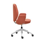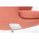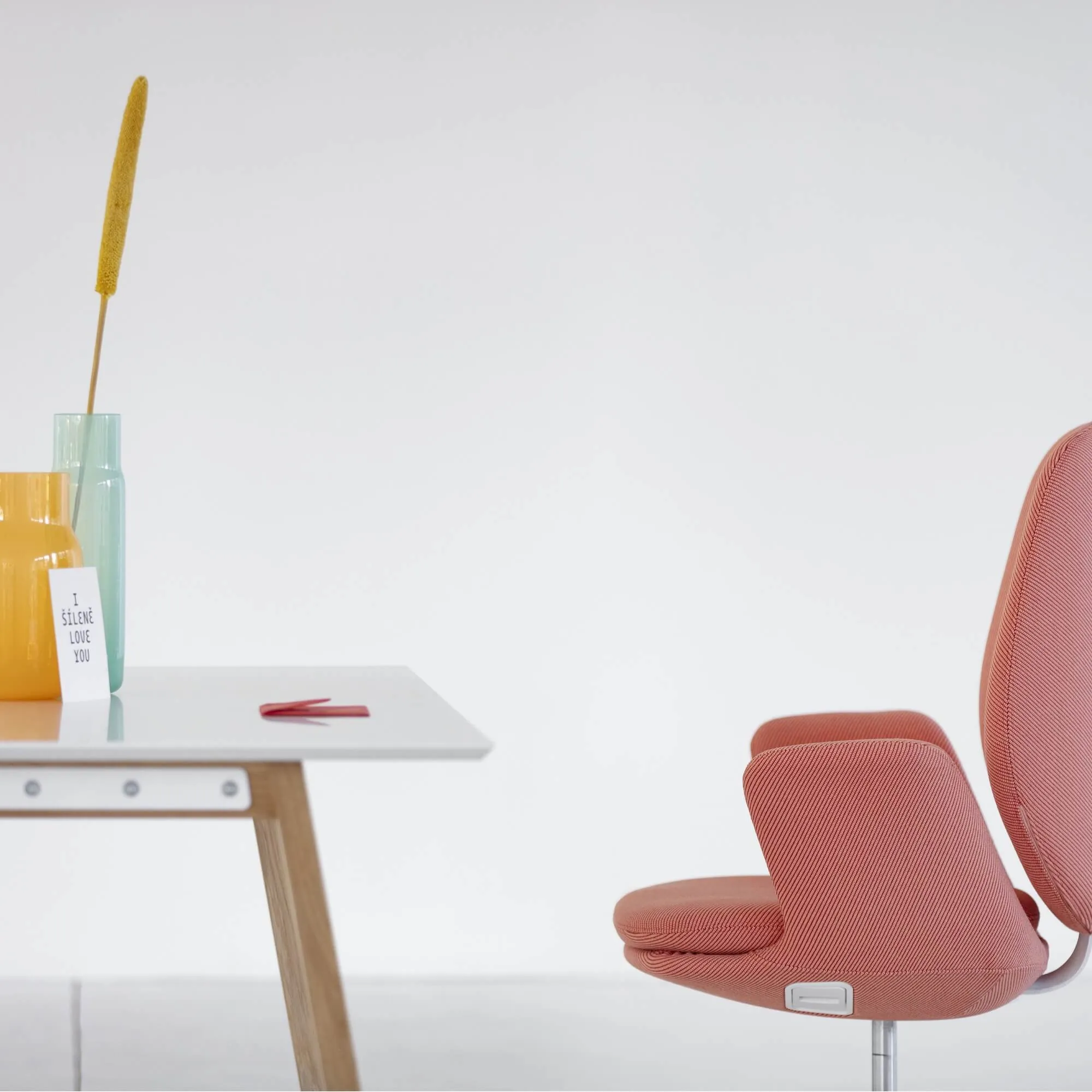 This chair is available in two color combinations: a white frame with coral backrest and seat fabric, ideal to serve as an accent piece in a neutral-colored office, while the second color combination in a black frame with gray backrest and seat fabric, blends beautifully into the background of a brightly colored office space.