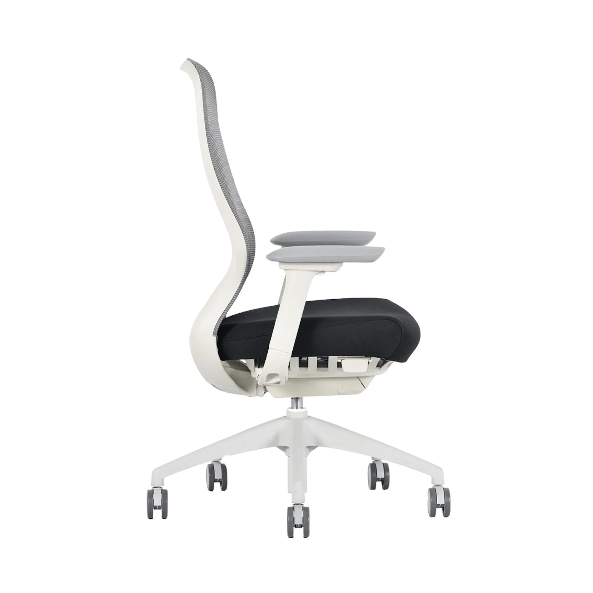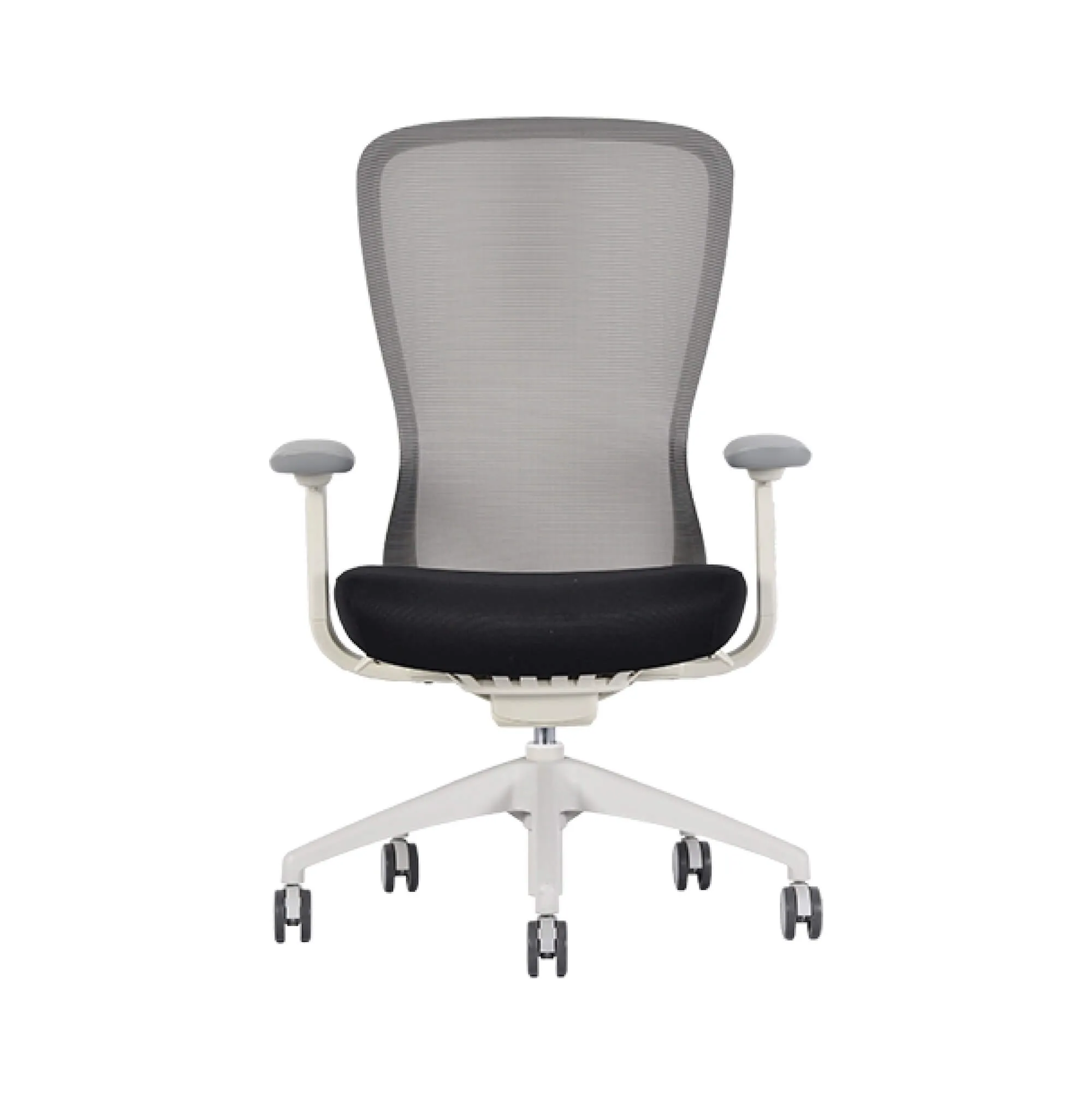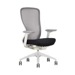 • White frame with black fabric seat and Satellite charcoal mesh back.