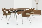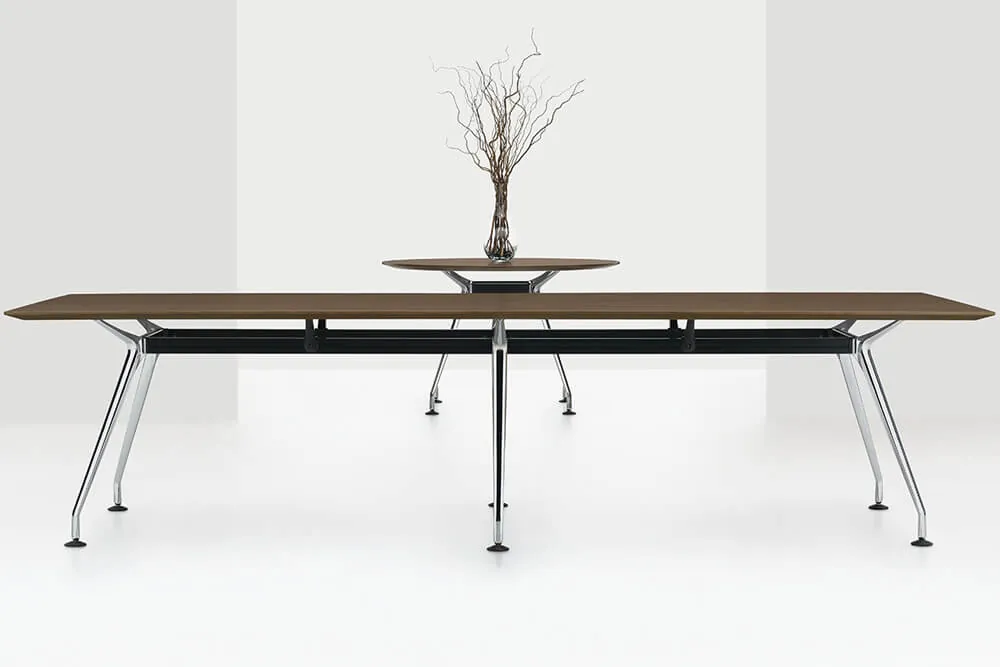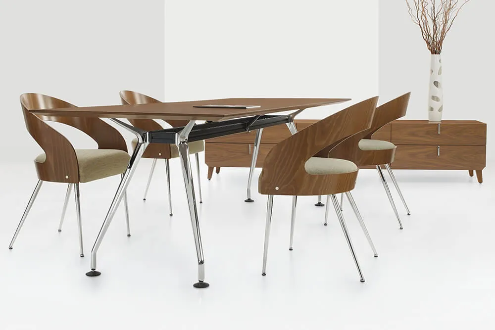 The Modern Conference Room Table Wood Top feature is ready to order in a walnut laminate table top matched with metallic chrome legs.