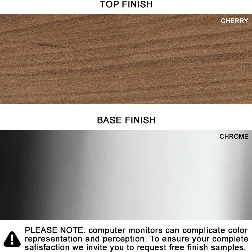 The round accent side table is ready to order in an Winter Cherry laminate top finish with a chrome finish leg and base but is also available in a range of other color combinations.