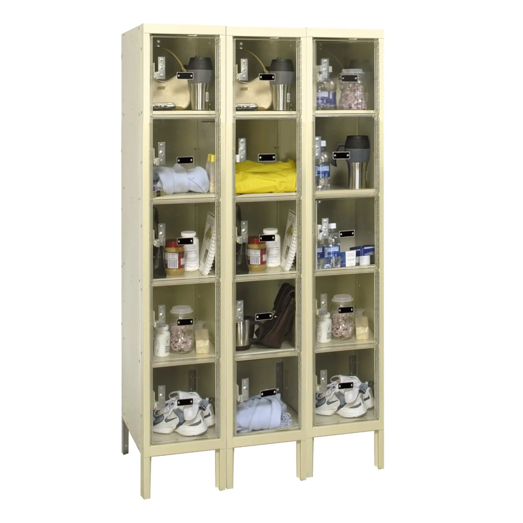 These three wide / five tall transparent lockers allow for visibility into the contents of the locker without sacrificing security. They are constructed from transparent arylic material. They are often utilized in areas like workplaces, gyms, schools, and retail establishments where keeping an eye on the contents of the lockers is crucial.