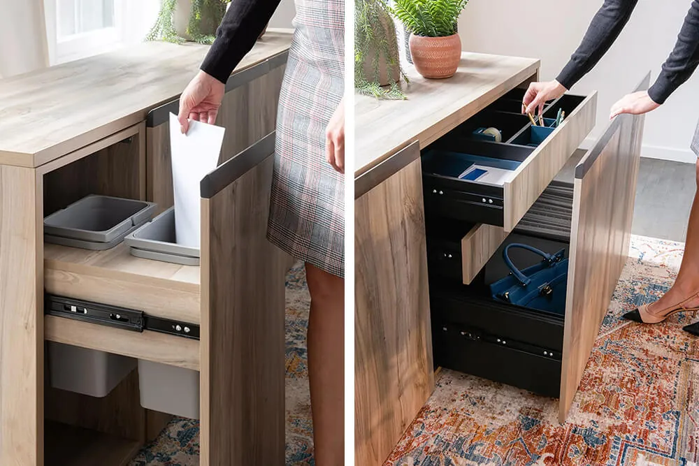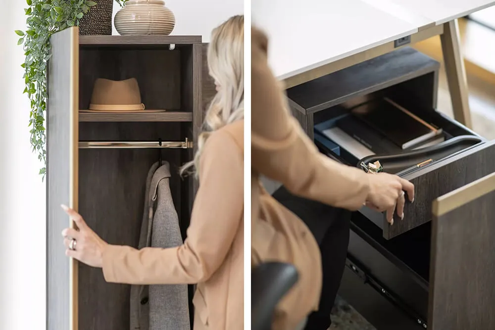 In this contemporary private office design setup, the private office desk is available in a high end Chalk white finish tabletop with light Sand wood legs, Light Grey felt modesty panel and outlets in Storm grey. Kali is the color of the dark wood laminate that creates a beautiful contrast in the office wall storage unit with cabinets and pedestals in the same uniform color.