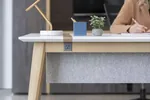 Introducing our functional yet contemporary private office design with this sophisticated setup. The centerpiece is a sleek, office desk with wooden legs, complemented by a soft felt modesty panel creating a Scandinavian office inspired focal point. Contrasting dark wall panels with integrated cabinets provide ample storage and a modern office aesthetic.