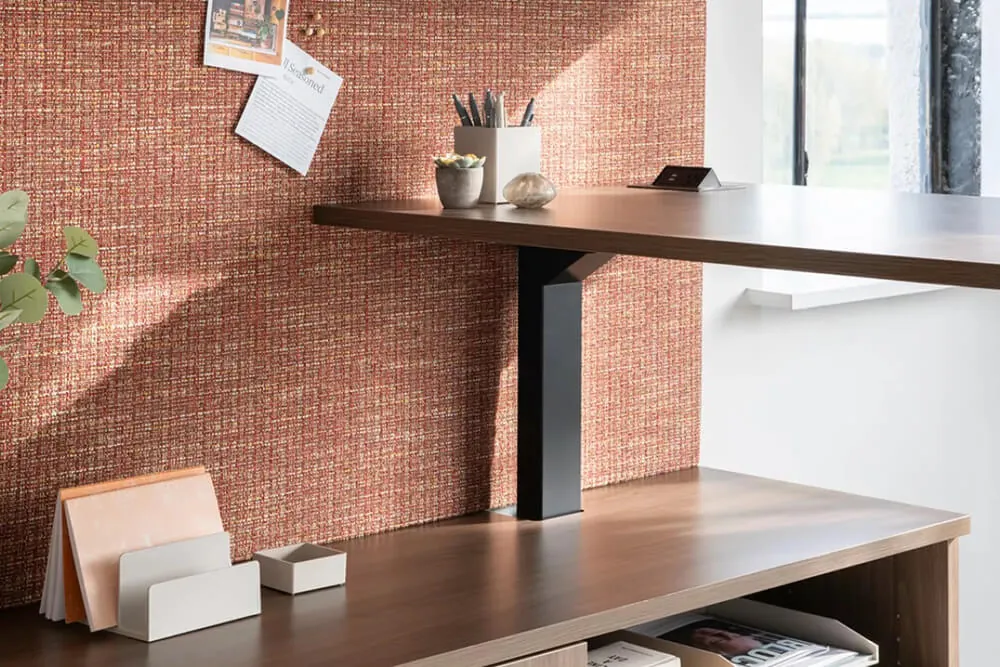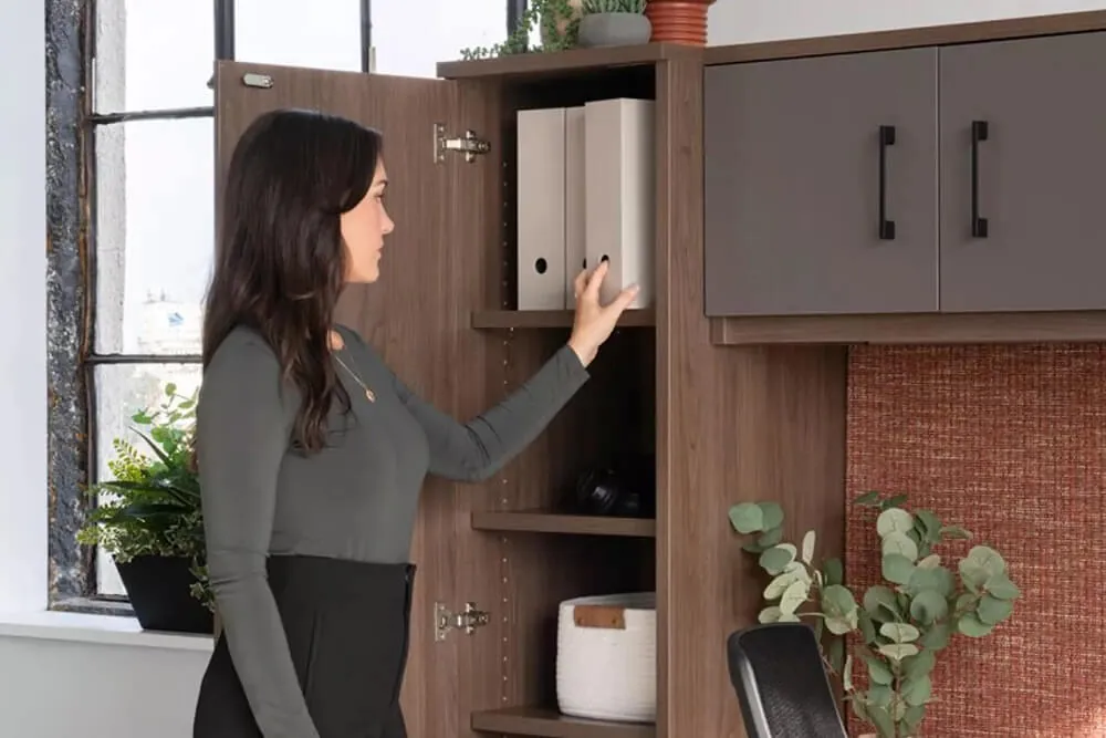 This industrial office setup comes standard in the following finishes: the storage tower with door and credenza cabinet with drawer in a Walnut laminate finish with a contrasting Grey laminate finish for the wall hutch storage, and the fabric tackboard in a rich Bordeax fabric.