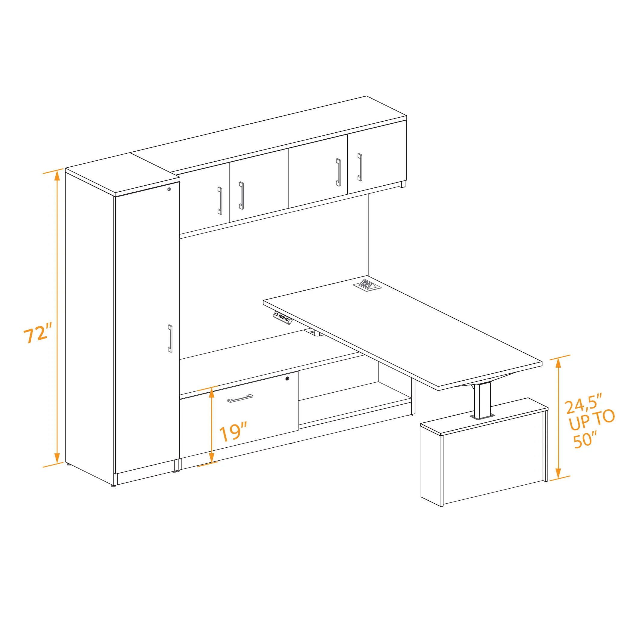 Transform your workspace with this Industrial Office Setup with Height Adjustable Desk where functionality and convenience meet. The industrial style office furniture set includes ample storage options, including a storage tower, credenza and overhead unit storage, ensuring a clear and well-organized workspace.