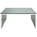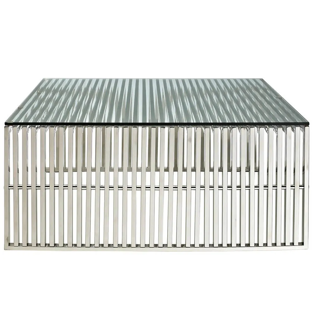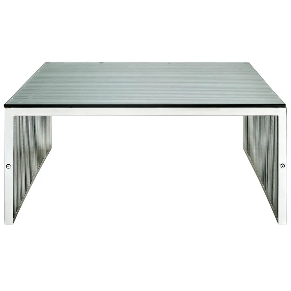 This showstopping, timeless stainless steel and glass coffee table features the below elements: