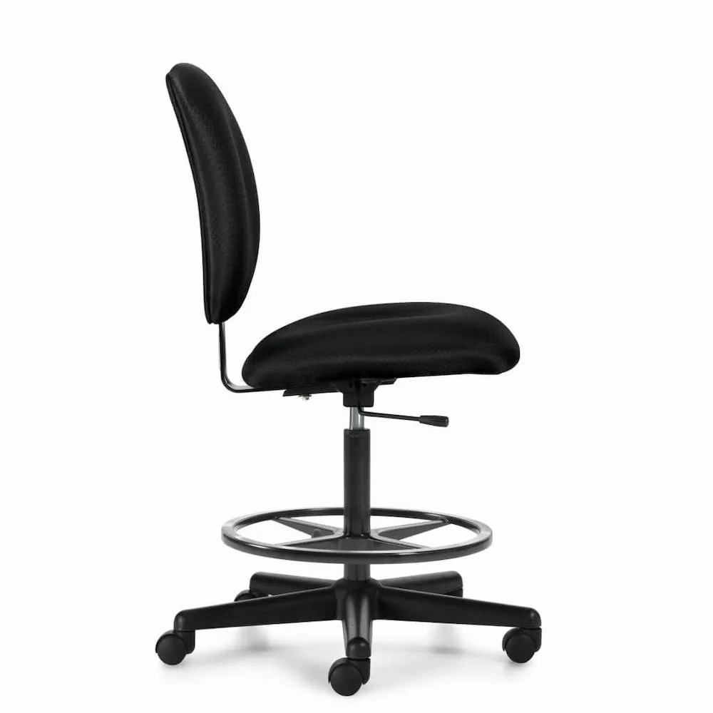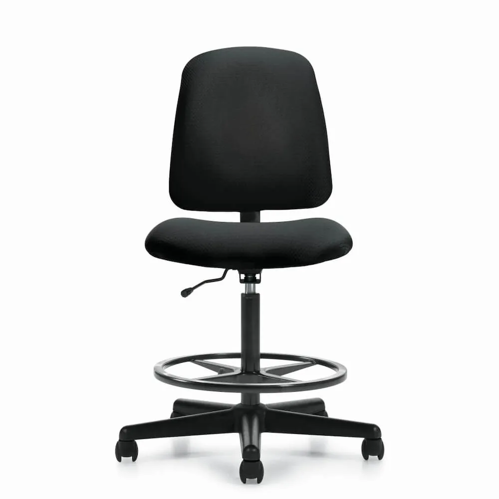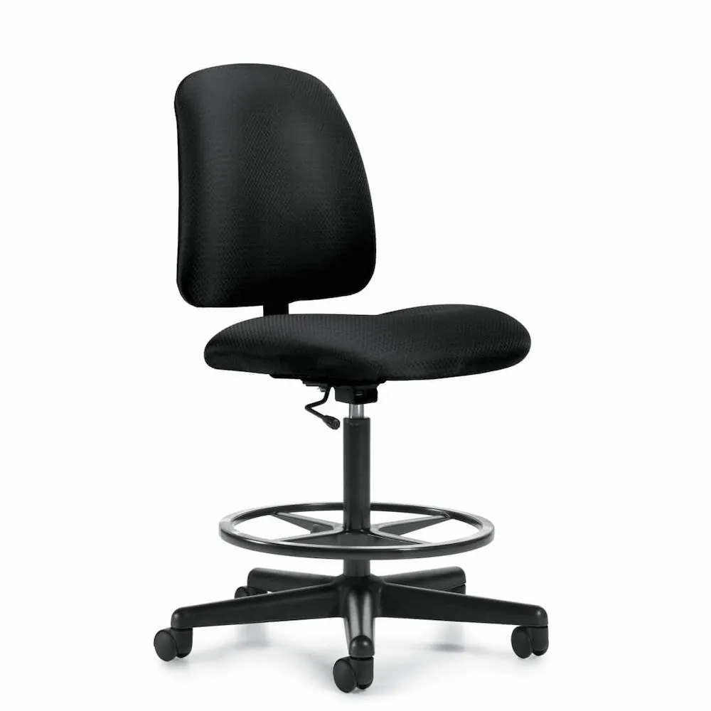 The drafting stool on wheels offers comfortable seating with a simple and elegant design. This ergonomic seat can compliment from an office workstation with counter-height tables or height adjustable desks to a home office with a standing desk. Featuring a patterned black fabric upholstery on the backrest and seat, it provides your body with proper support, especially for your back, ensuring you maintein the correct posture.