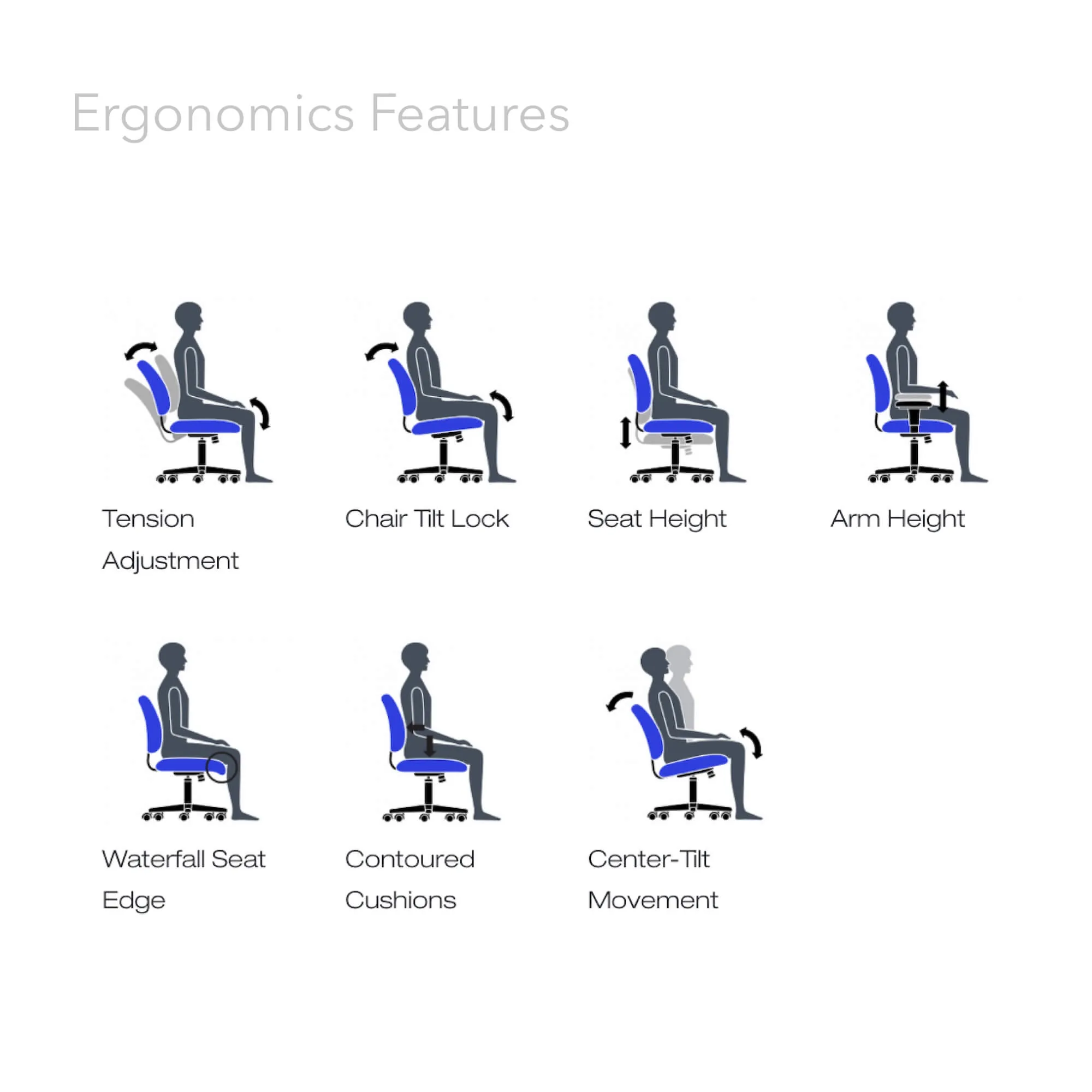 This tilter chair is designed to enhance comfort for long working hours, offering a number of ergonomic features including: