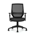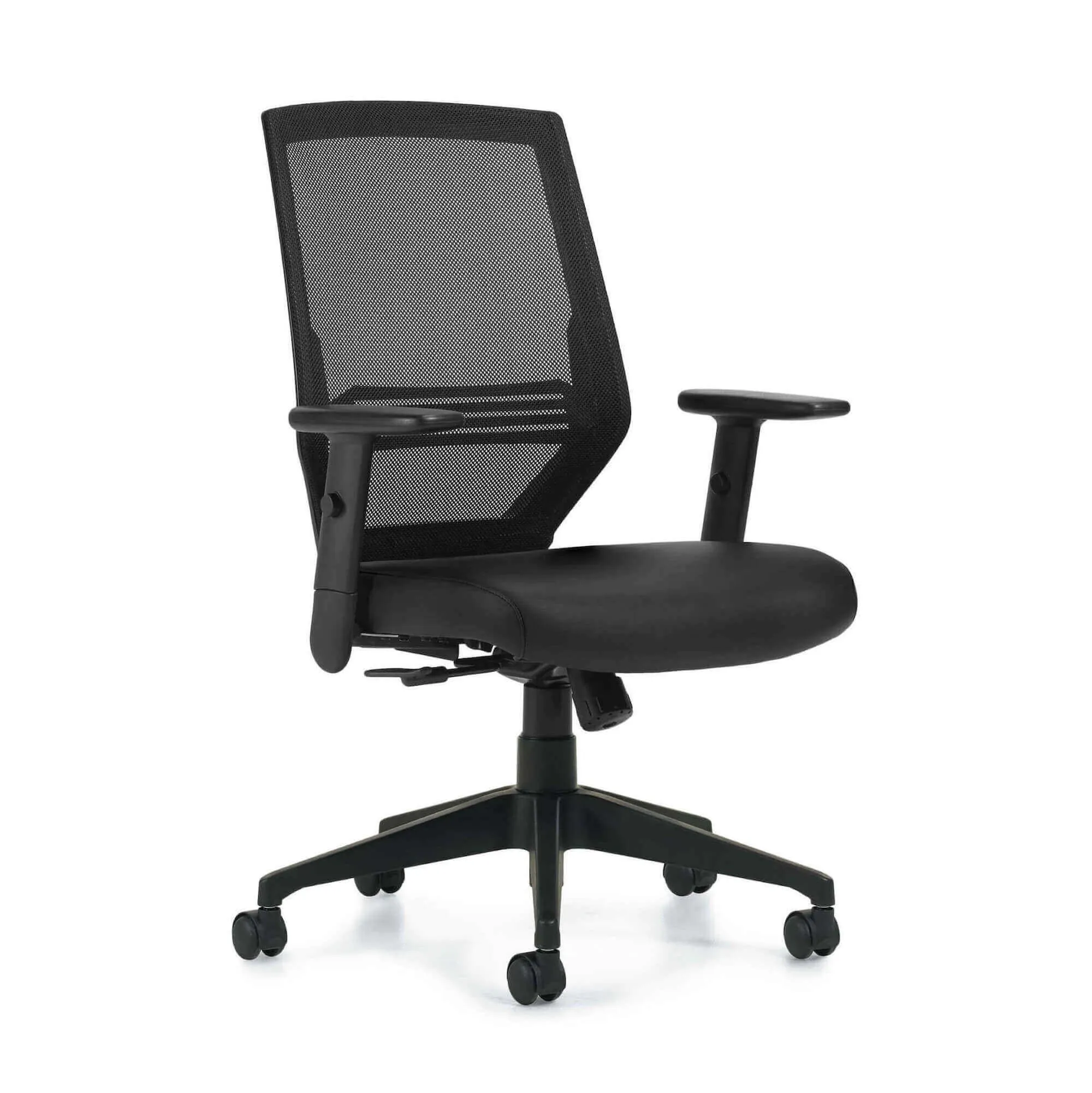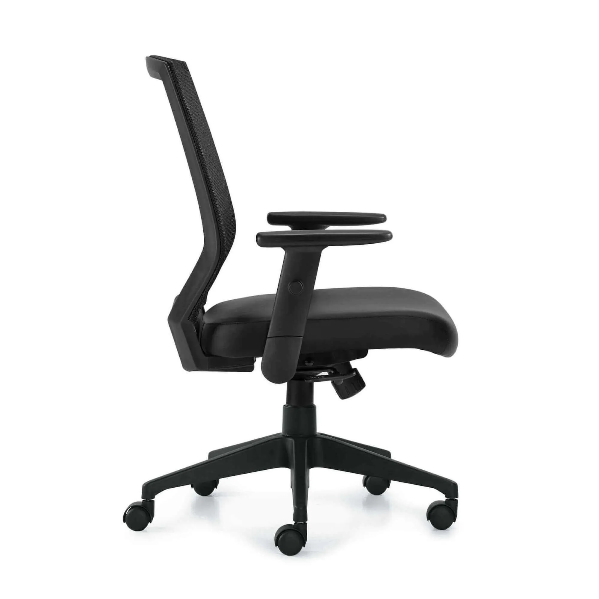 This chair features a black mesh back and a black luxhide seat, complemented by a black base and armrests. With its sophisticated design and versatile materials, this chair is an excellent addition to any worksapce or personal office space.