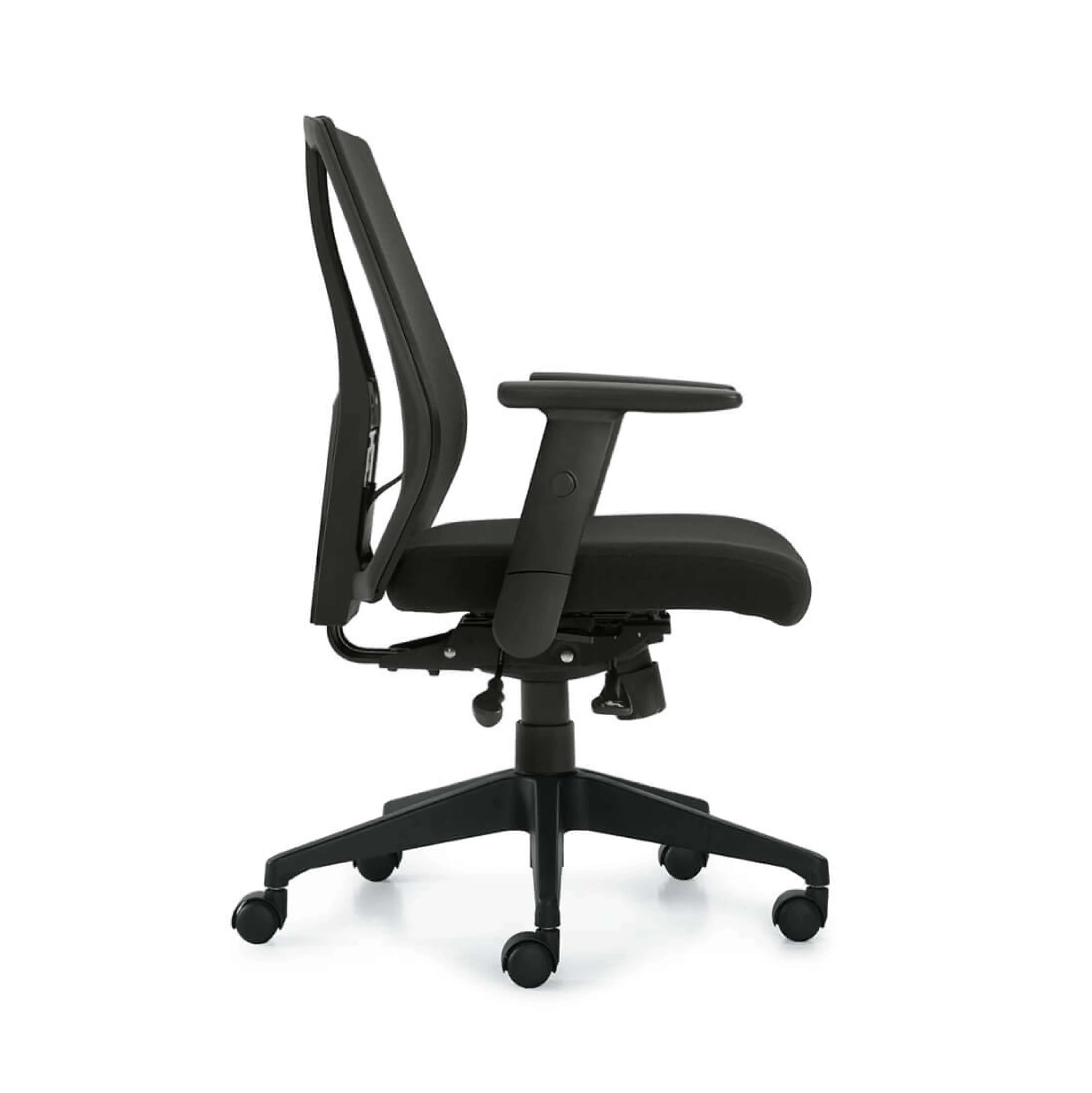 The ergonomic seat is available in sleek black, featuring mesh and fabric padded seating, with matching black structure, base and armrests, ensuring a seamless integration into any office look complementing various style effortlessly. Our black ergonomic chair combines style with functionality. Furthermore, this seat is upholstered with thick fire-restardant standard padding, prioritizing safety and comfort.