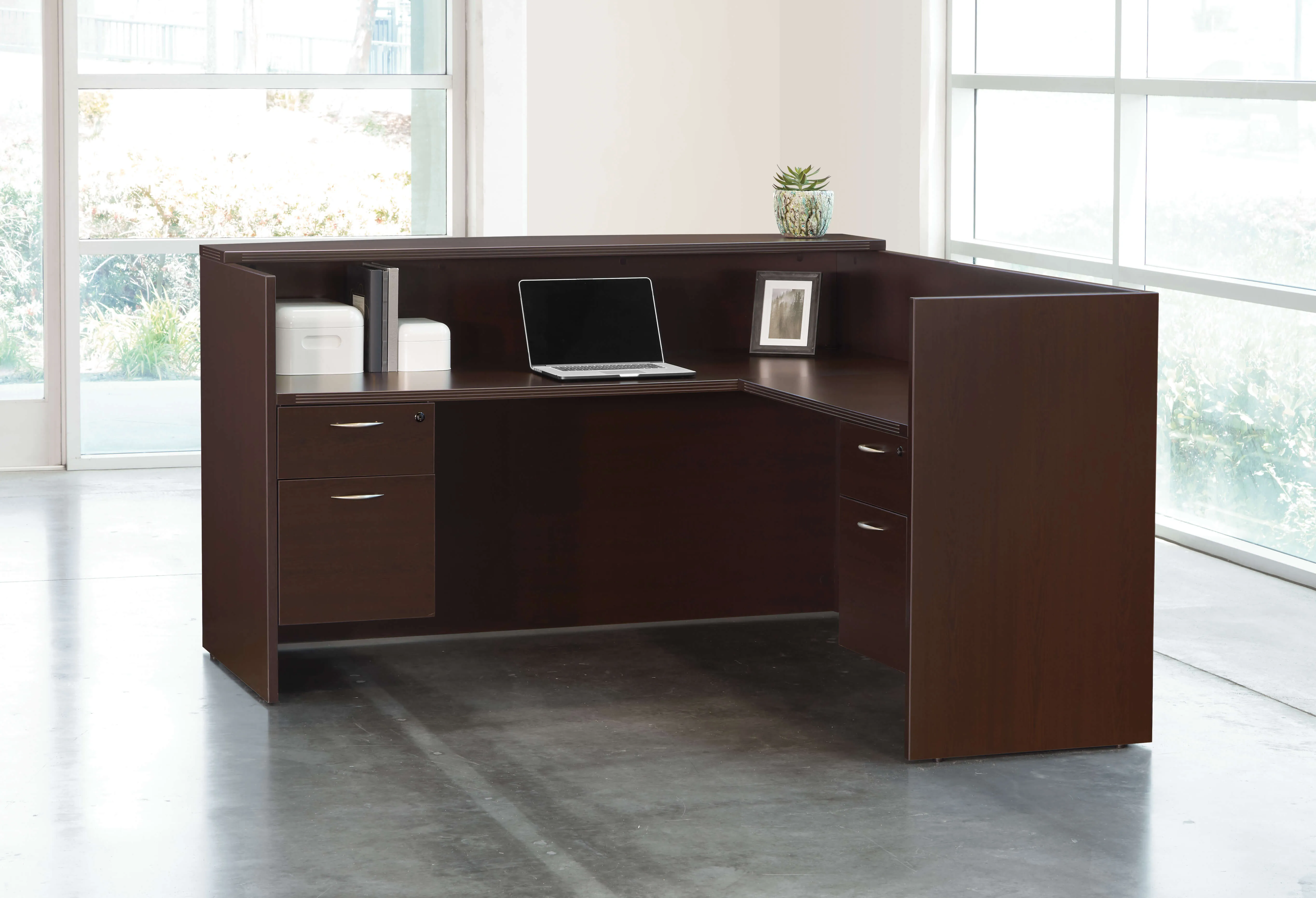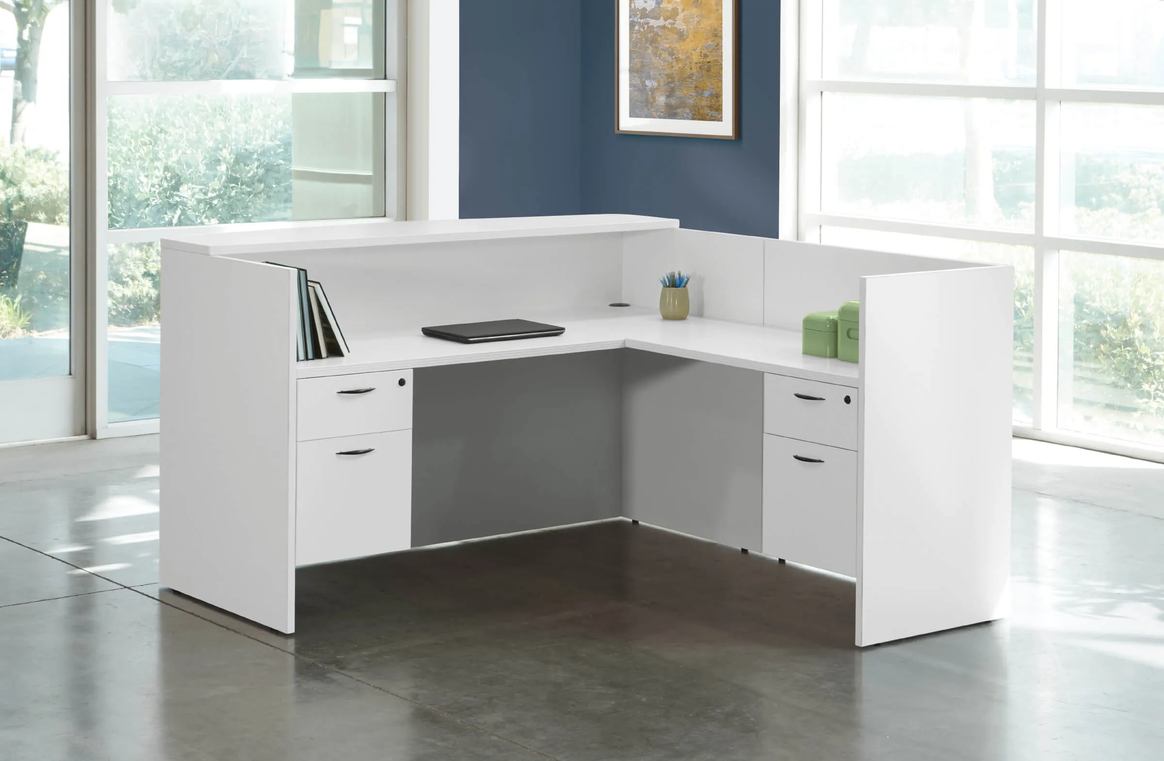 The contemporary reception desk includes the following components descripted below: