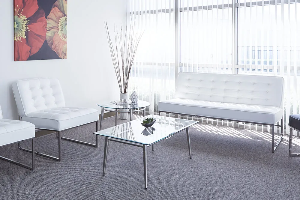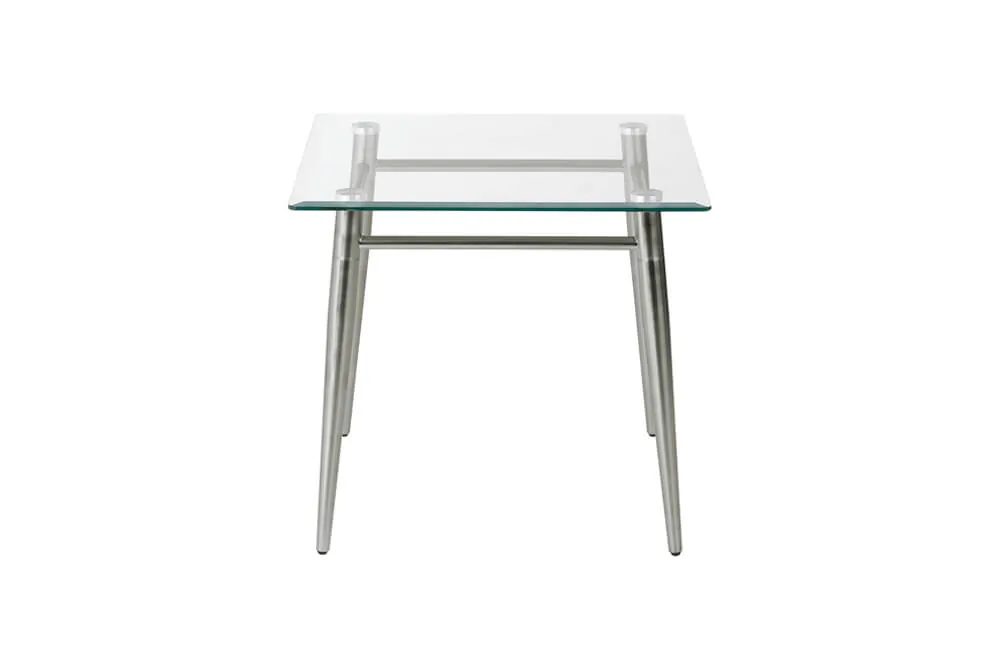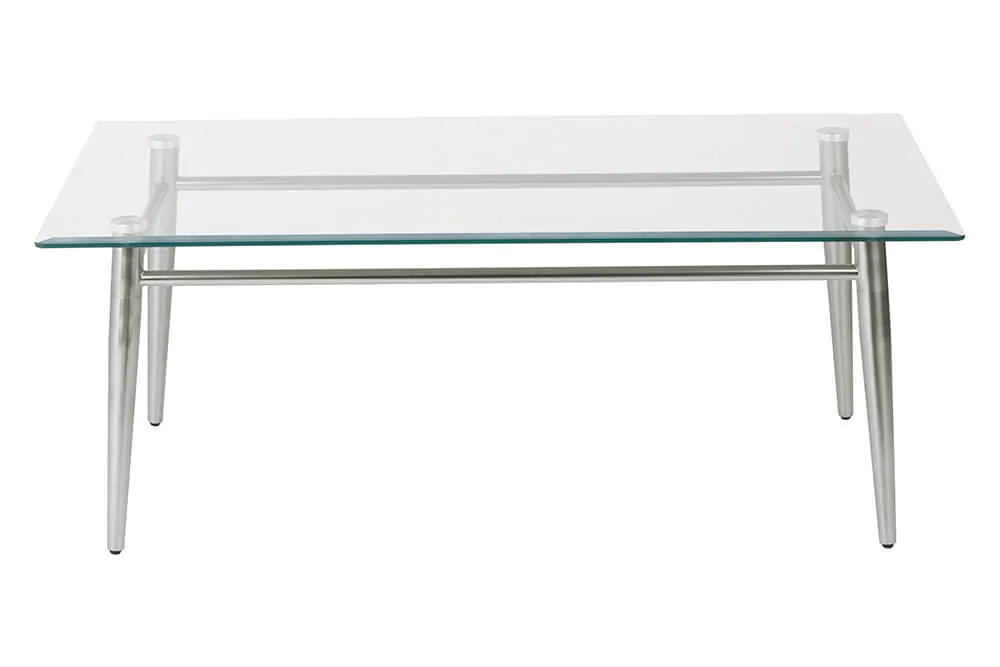Introducing our elegant glass coffee table with metal base collection, designed to bring a touch of sophistication to your corporate office space. This collection features both square and rectangular coffee table designs, each crafted with a clear glass top and sturdy metal legs in a brushed nickel finish. Perfectly blending form and function, these tables are ideal for any modern decor.