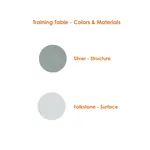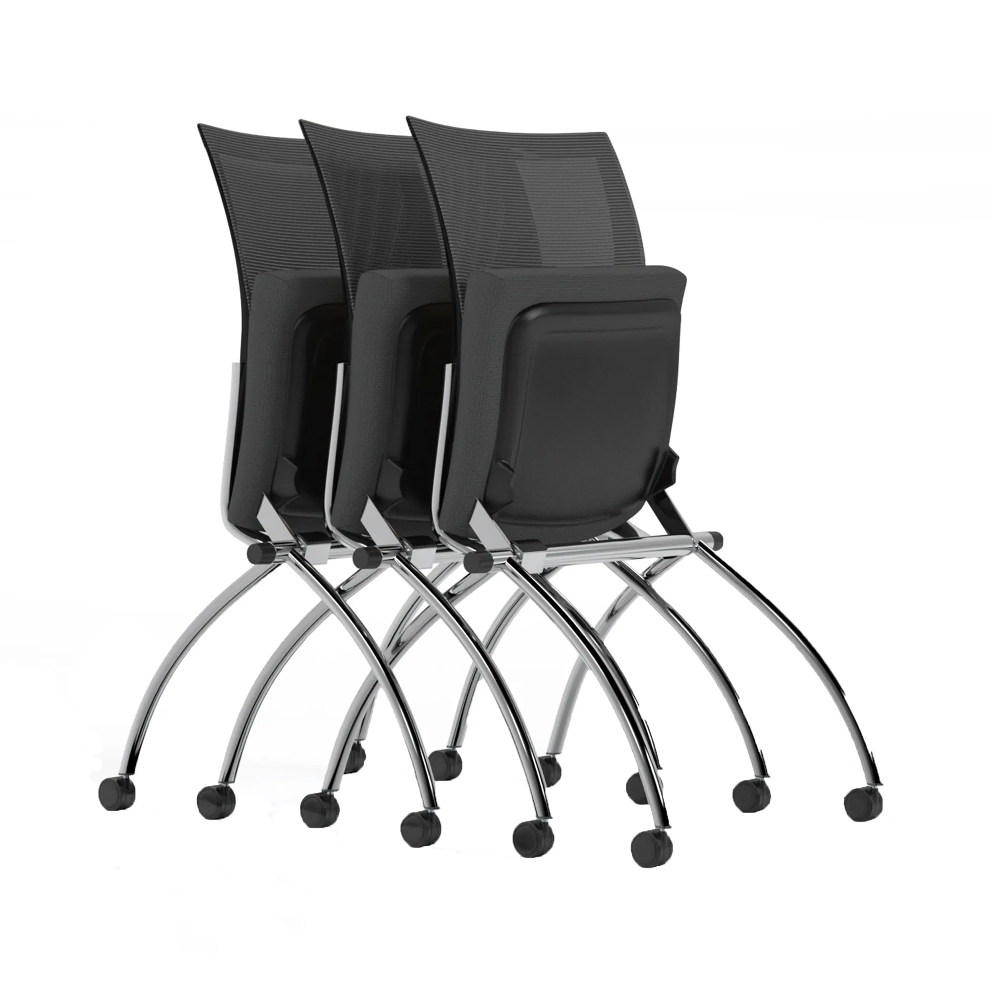The training room table features dual-sided levels to quicky change from horizontal to vertical, and straight-line nesting for easy storage and an integrated modesty panel with built-in cable management. 4 locking casters bring an easy mobility as positioning, ganging kits included to connect tables together. The training room chair has mobile dual-hooded casters for easy reconfiguration of space as needed with chrome base, black fabric and a mesh, a synchro tilt movement system.