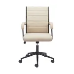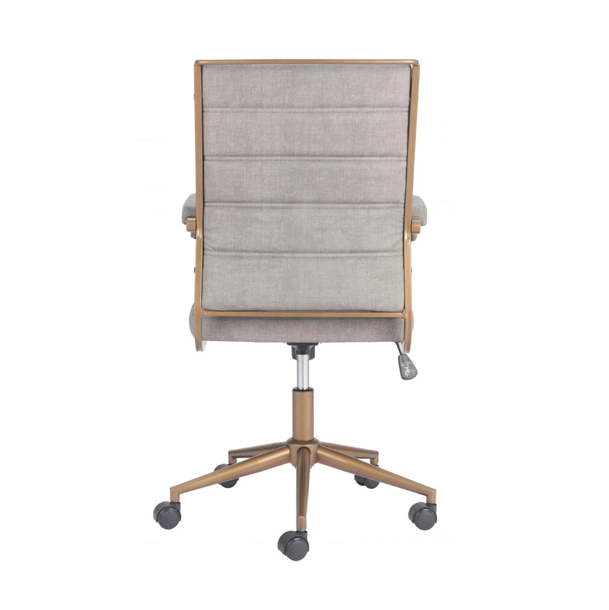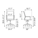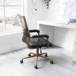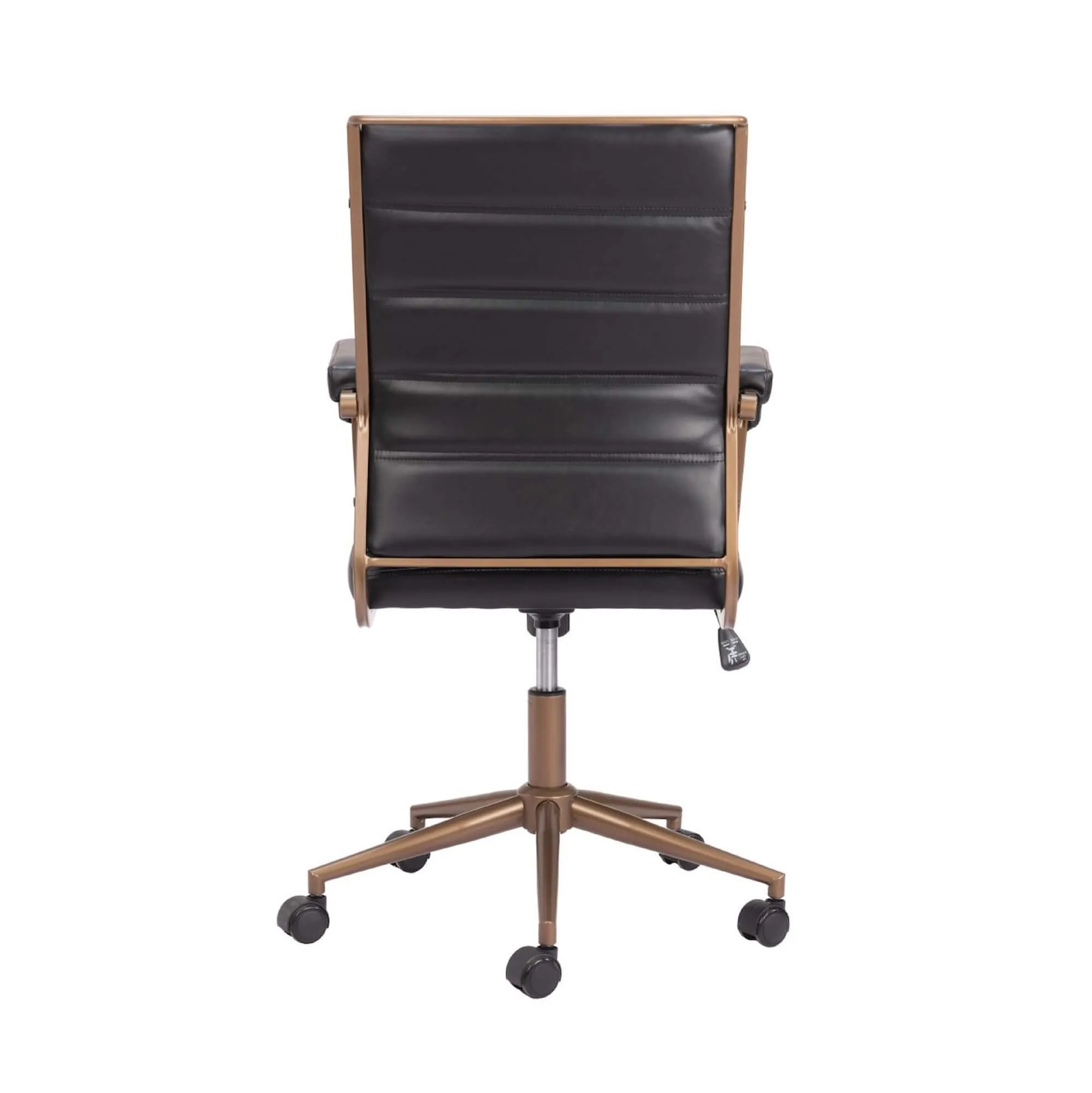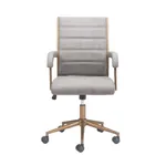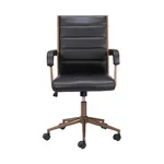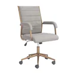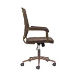 This office chair is made with a medium high back and a covered seating of faux leather 100% Polyurethane for the two dark color variantions and with upholtery fabric for the two clear color options, also is made on plywood and powdered coated steel structure for the base and arms. Coming in four color combinations: Black (leather) with bronze structure, Brown (leather) with bronze structure, Gray (fabric) also with bronze structure and finally in Beige (fabric) with a black structure.