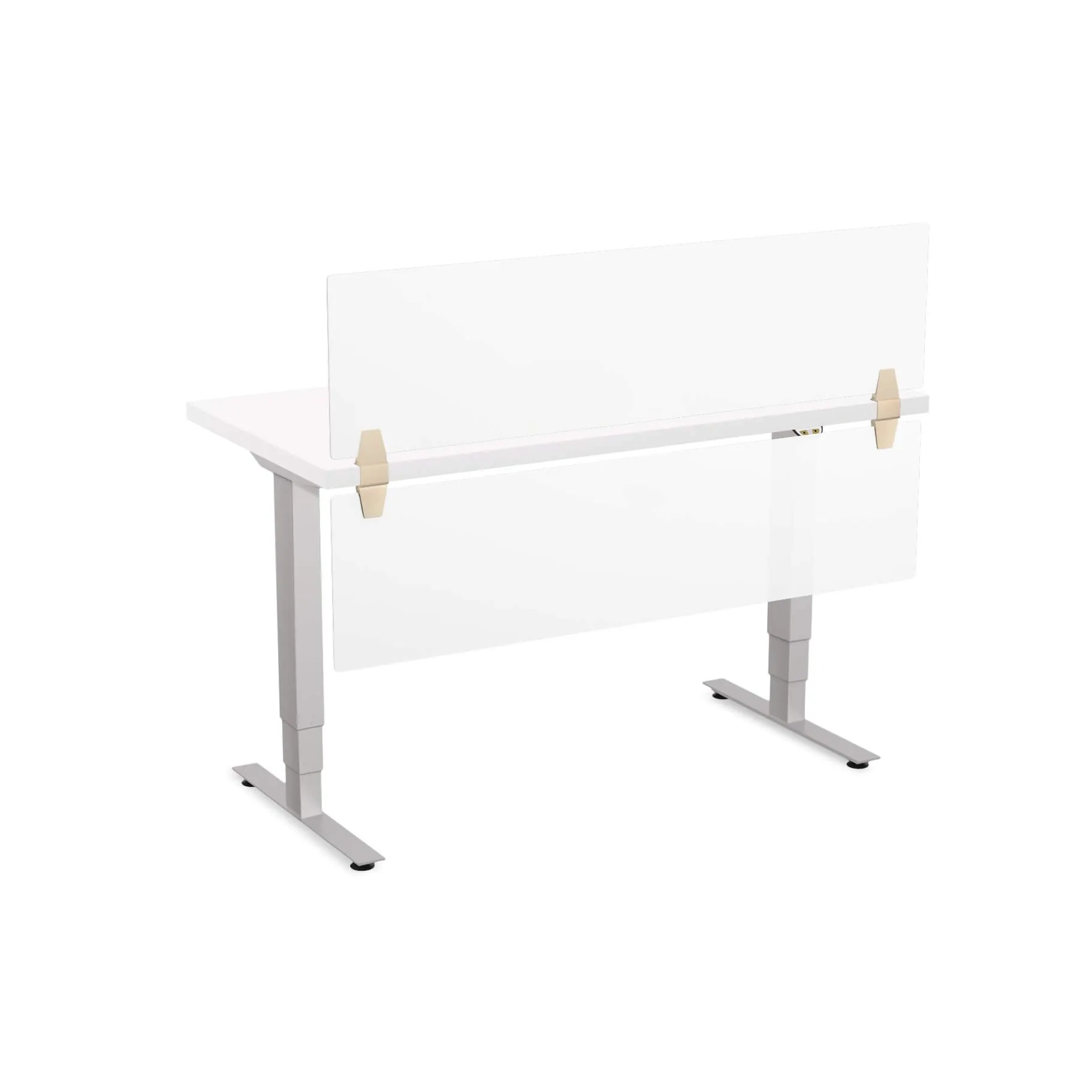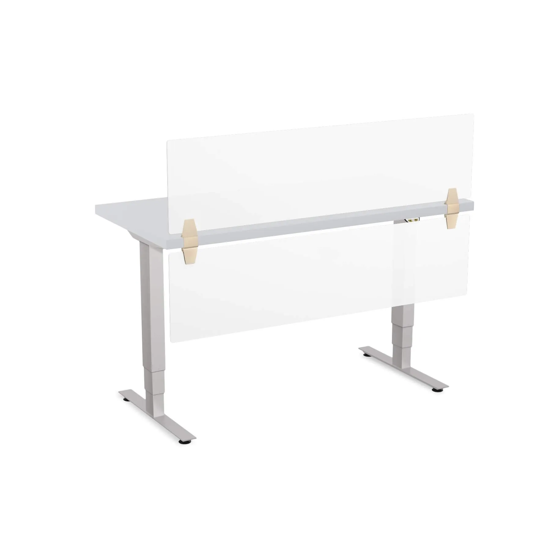 Do you like bells and whistles? This sit stand adjustable desktop model has both. Two frosted acrylic privacy screens grace the top and bottom of the adjustable office desk front, offering you ultimate privacy for what’s going on both above and below the surface. Plug your devices into electric or USB ports right at your fingertips, on the clamp-style module that follows you up or down as you adjust your work area from sitting to standing and back to sitting again.