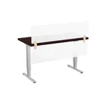 This sit stand desk features low pressure laminate surface with 3mm PVC edge and legs with metallic silver finish. The privacy and modesty panels are made of frosted acrylic. The work surface is available in five colors: Light Grey, White, Cherry, Mahogany and Espresso.