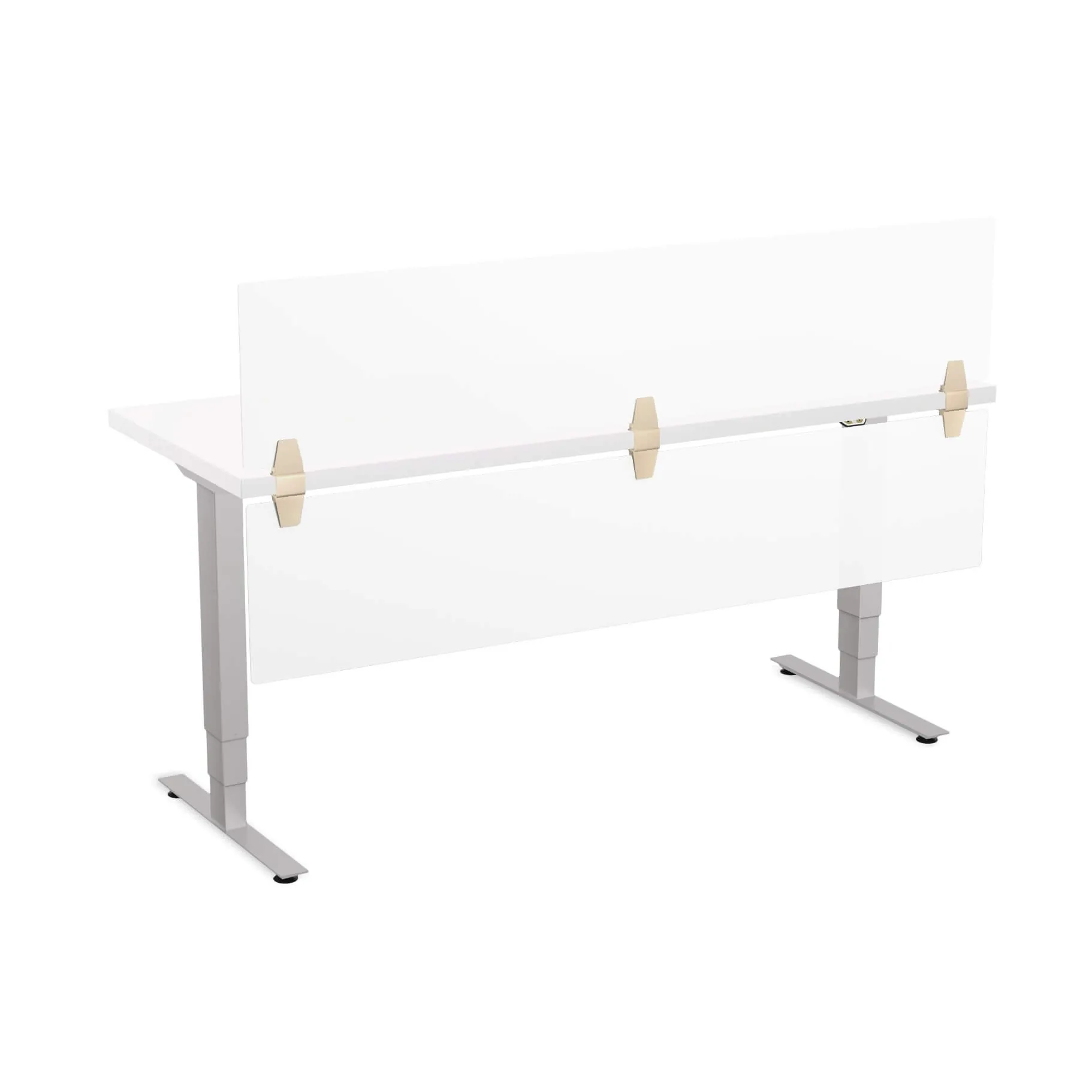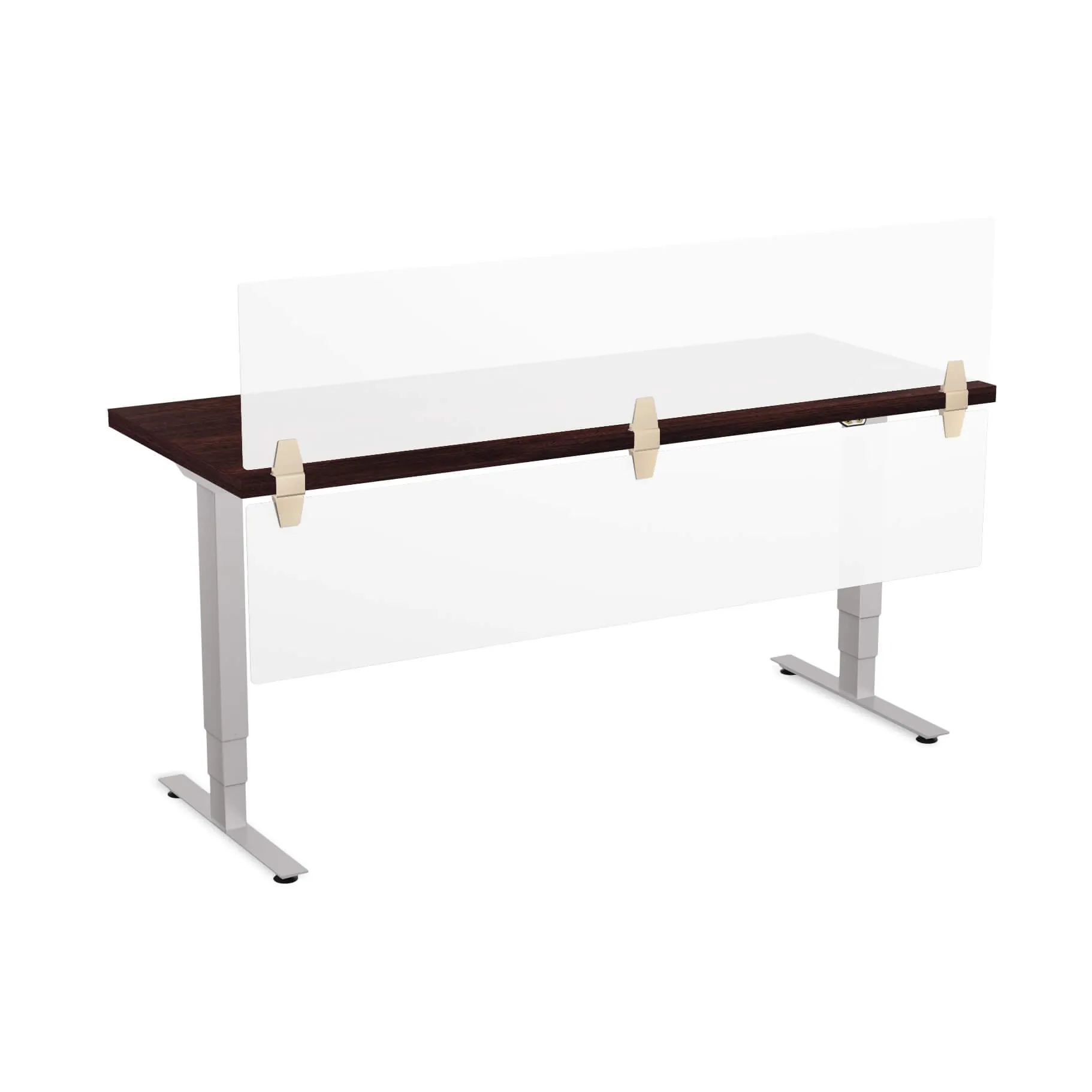 Do you like bells and whistles? This sit stand adjustable desktop model has both. Two frosted acrylic privacy screens grace the top and bottom of the adjustable office desk front, offering you ultimate privacy for what’s going on both above and below the surface. Plug your devices into electric or USB ports right at your fingertips, on the clamp-style module that follows you up or down as you adjust your work area from sitting to standing and back to sitting again.