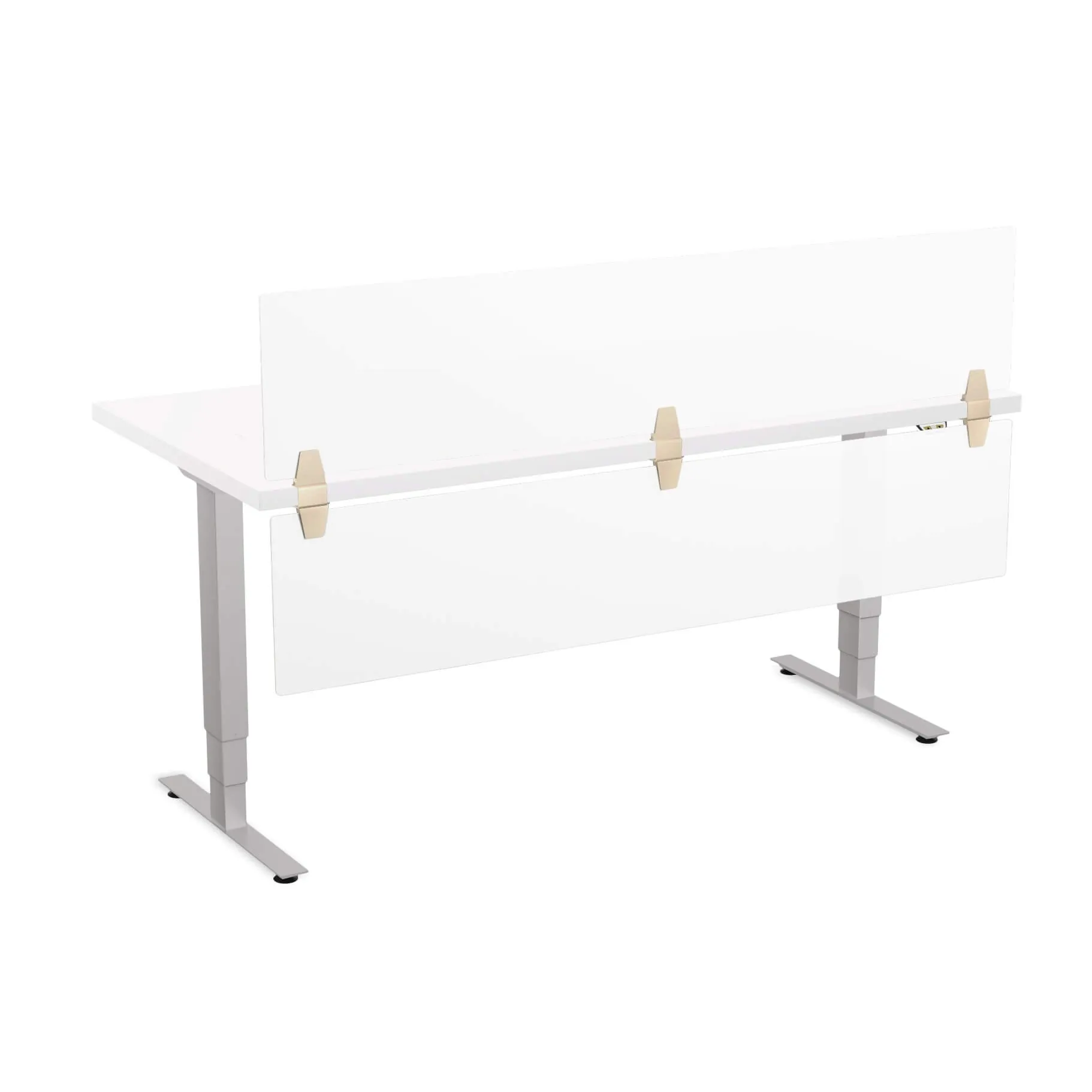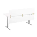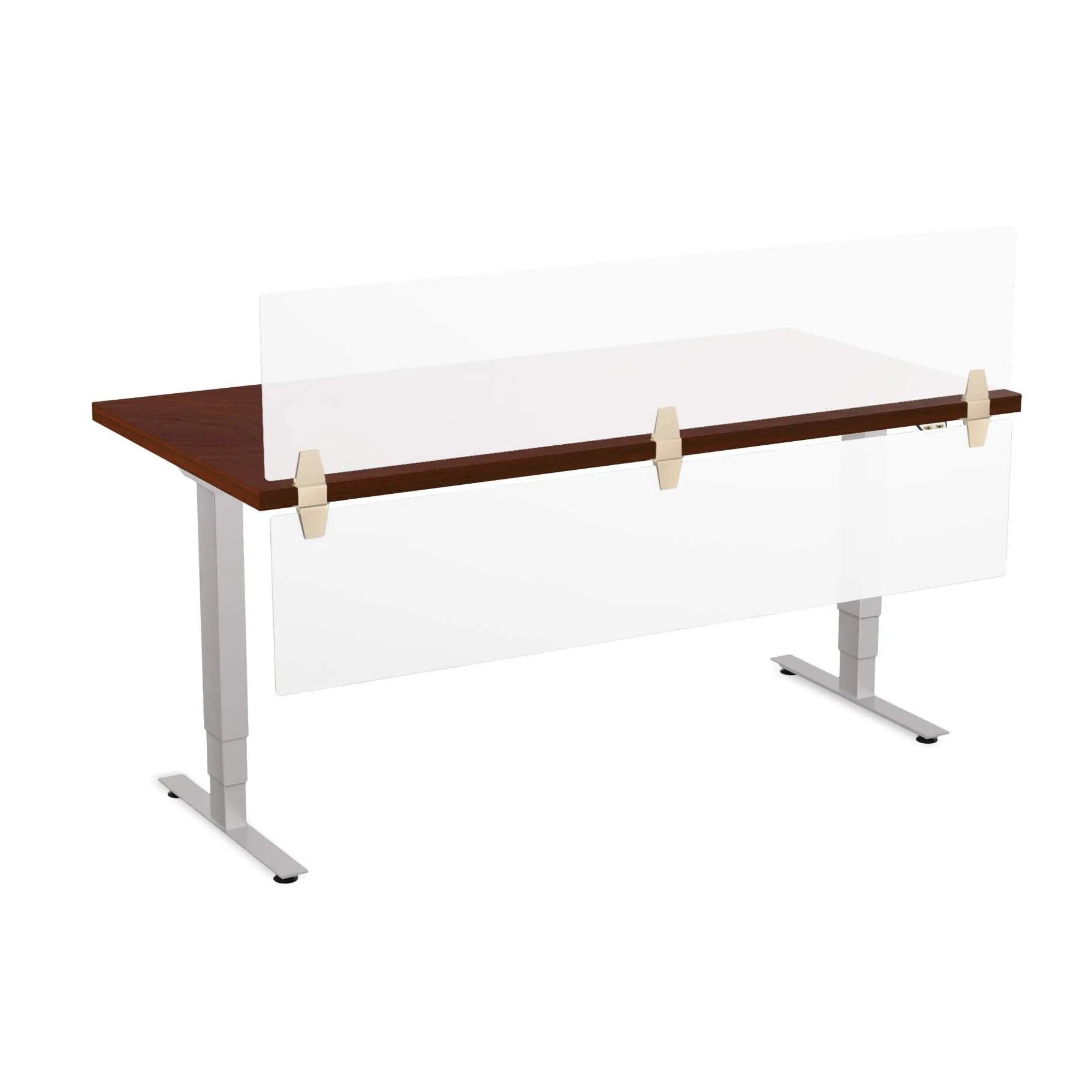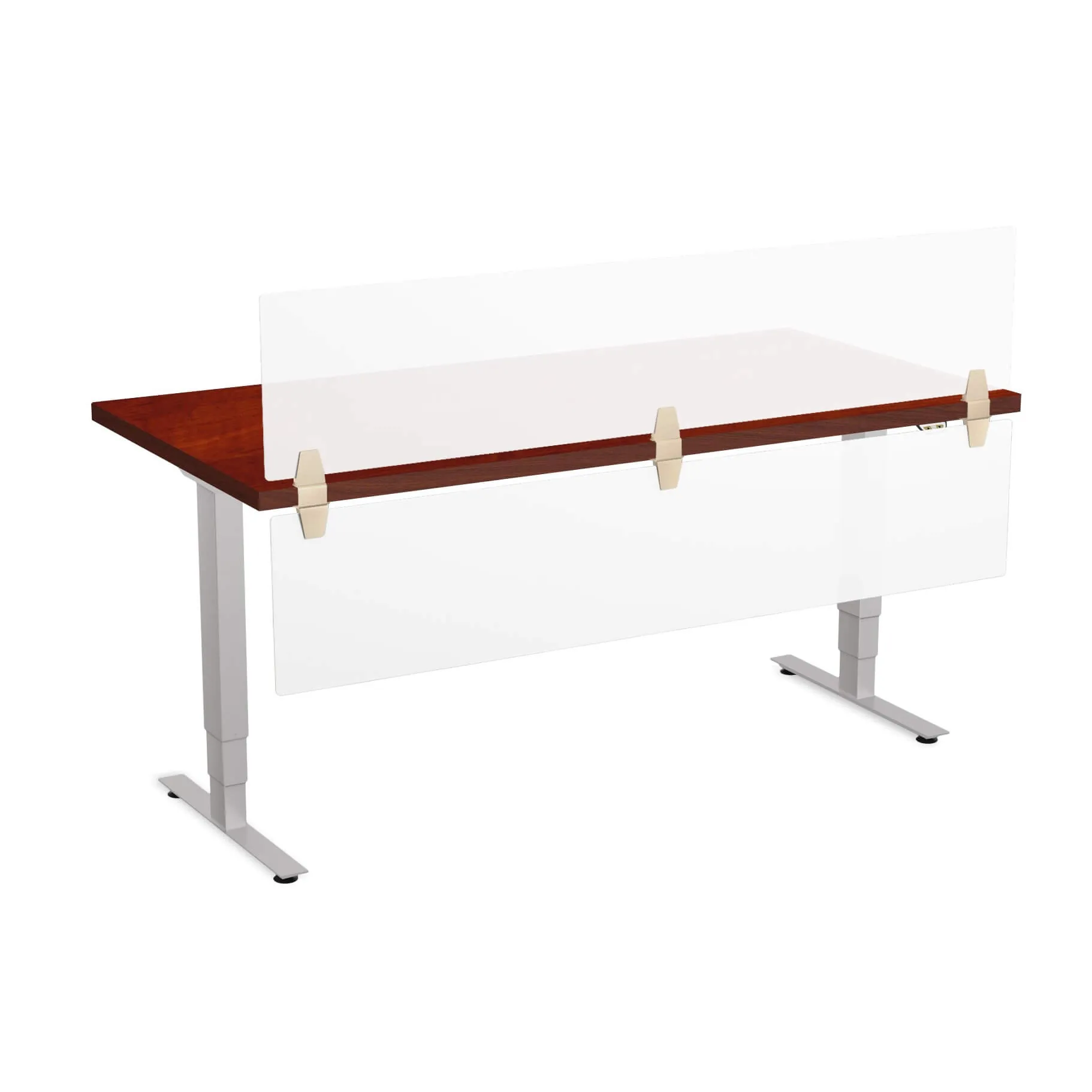 This sit stand desk features low pressure laminate surface with 3mm PVC edge and legs with metallic silver finish. The privacy and modesty panels are made of frosted acrylic. The work surface is available in five colors: Light Grey, White, Cherry, Mahogany and Espresso.