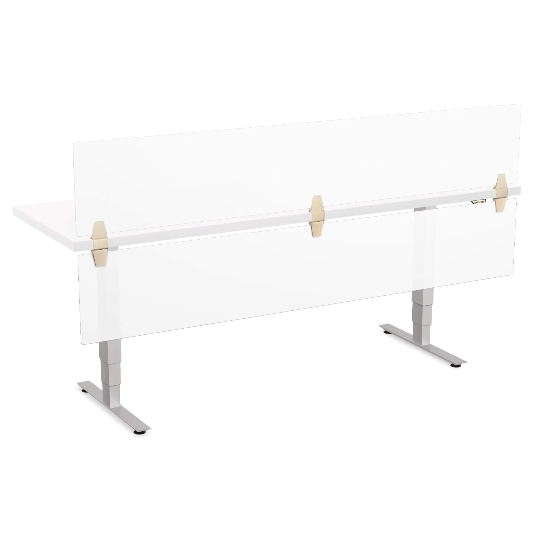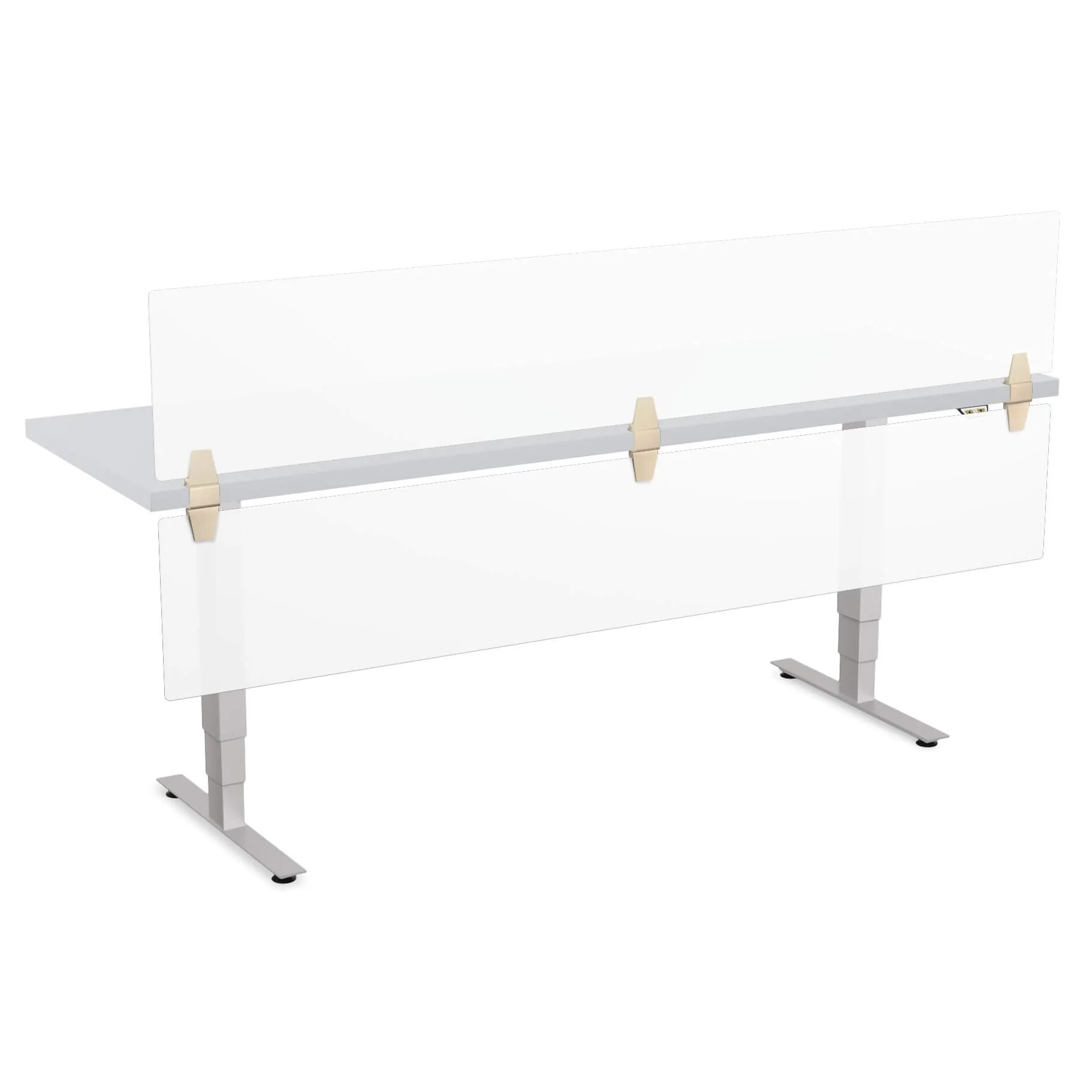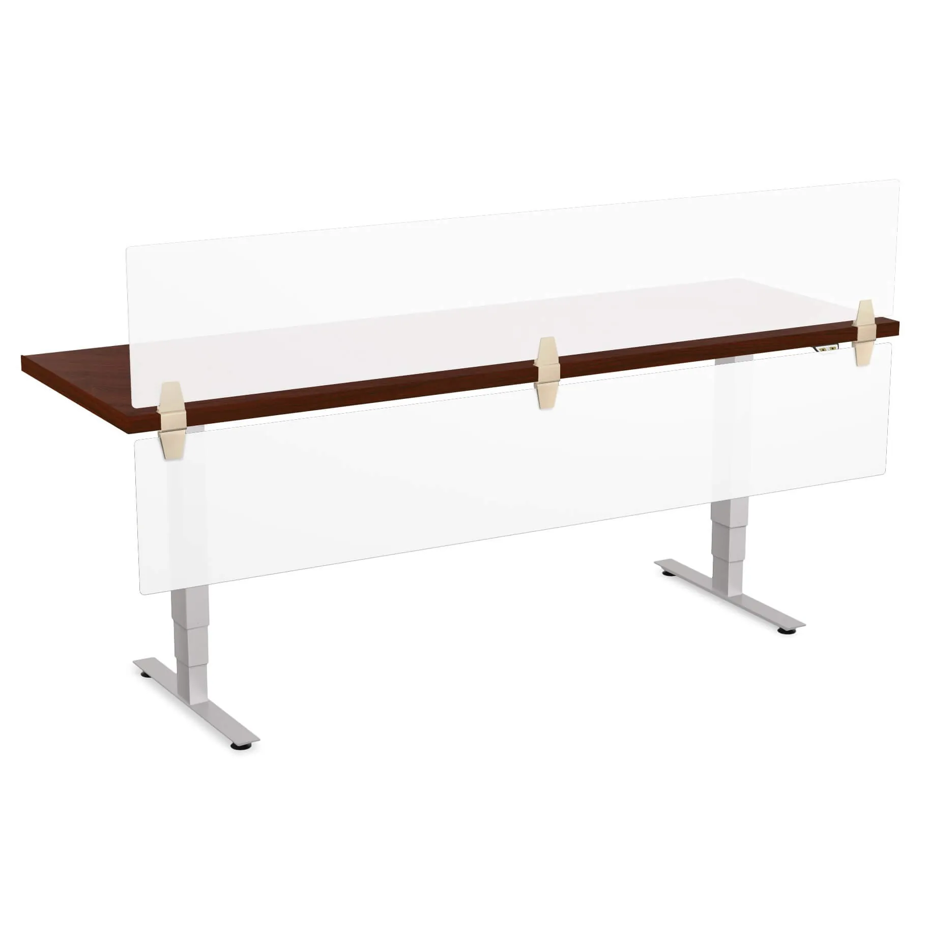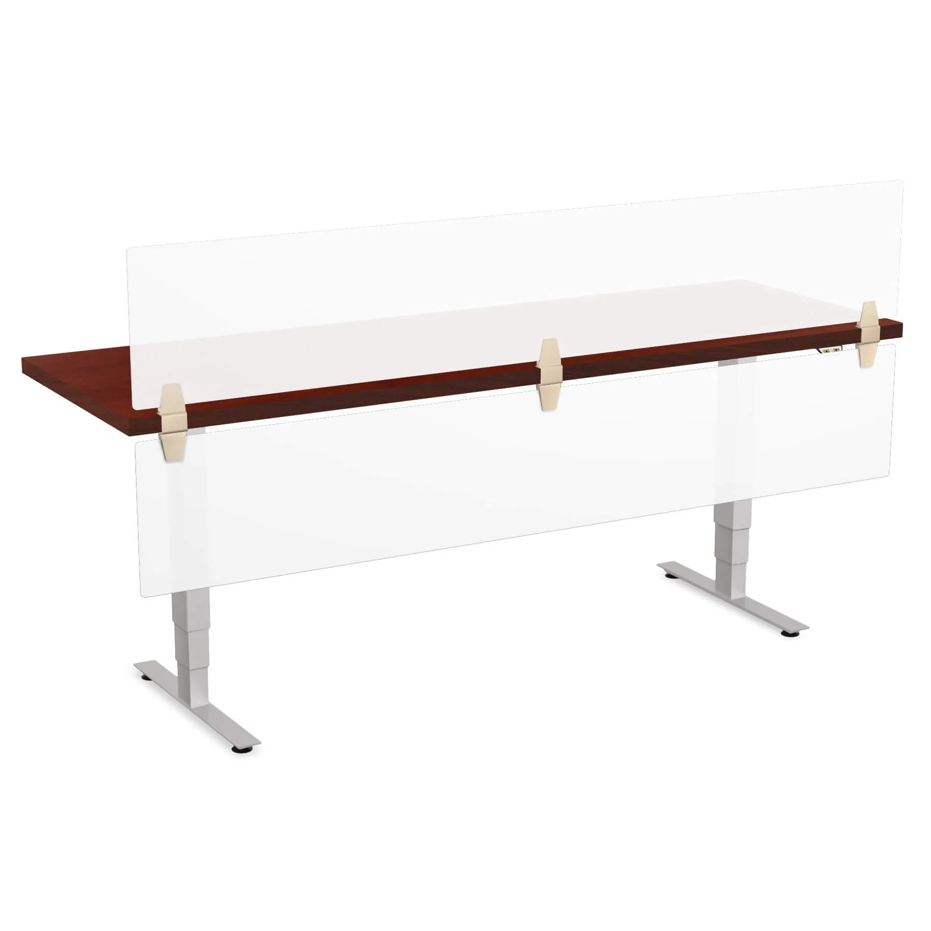 Do you like bells and whistles? This sit stand adjustable desktop model has both. Two frosted acrylic privacy screens grace the top and bottom of the adjustable office desk front, offering you ultimate privacy for what’s going on both above and below the surface. Plug your devices into electric or USB ports right at your fingertips, on the clamp-style module that follows you up or down as you adjust your work area from sitting to standing and back to sitting again.
