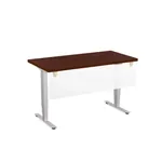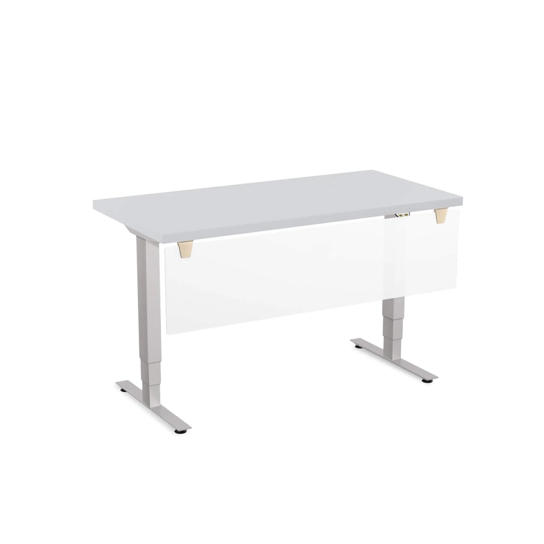 This sit stand desk features low pressure laminate surface with 3mm PVC edge and legs in a metallic silver finish. The privacy panel is made of frosted acrylic. The work surface is available in five colors: Light Grey, White, Cherry, Mahogany and Espresso.