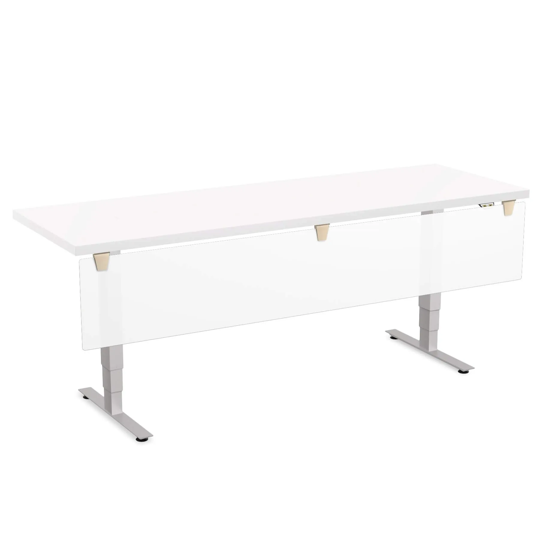 What could possibly make an electric height adjustable desk even cooler? Added features like a desktop power/data box and a hanging modesty panel. At both seated and standing height, the sophisticated frosted effect provides sufficient privacy for whatever’s going on below the surface, with a clean, contemporary aesthetic. Simple up/down controls in the front corner of this height adjustable office table grant you convenience and freedom to move from sitting to standing throughout your workday.