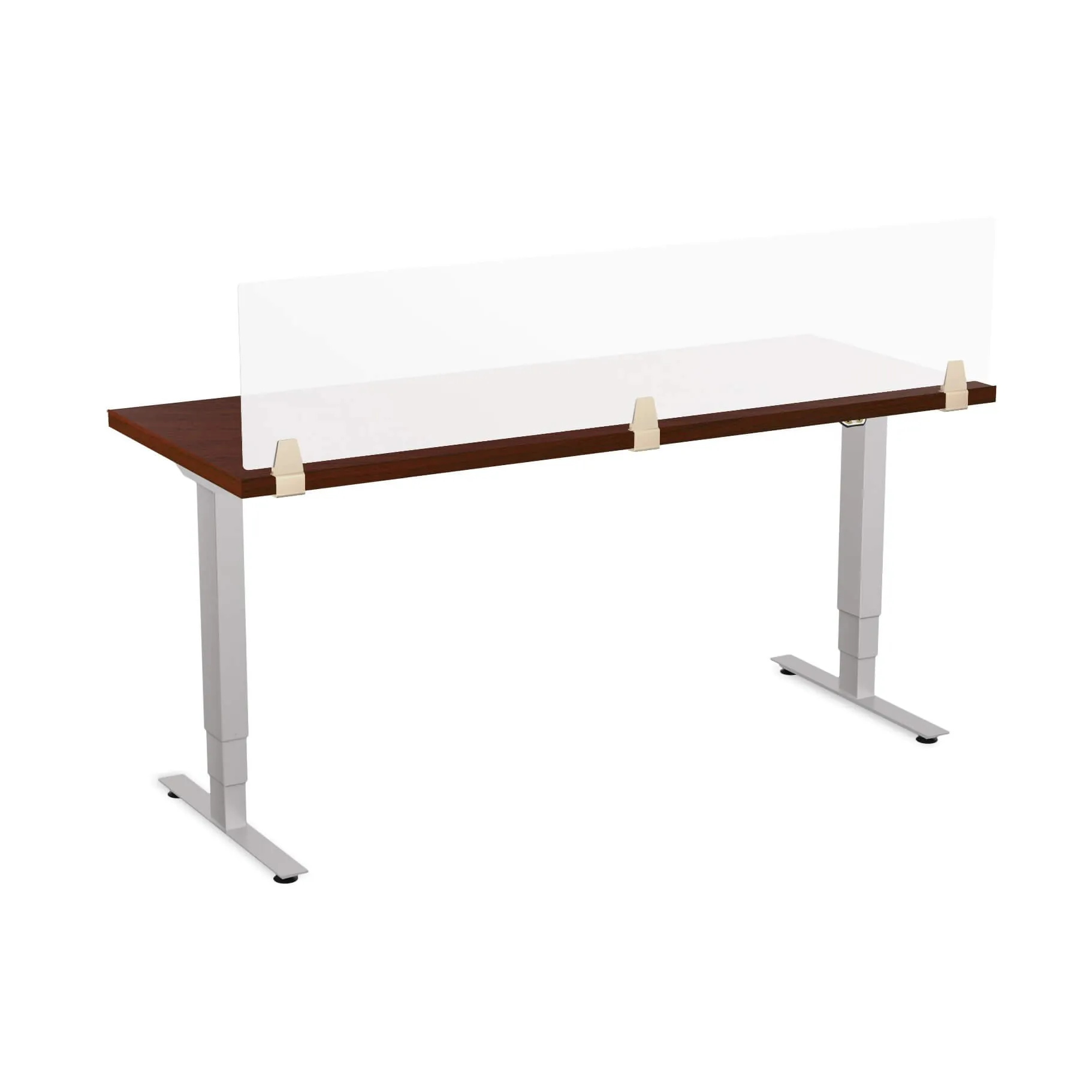 This sit stand desk features low pressure laminate surface with 3mm PVC edge and legs in a metallic silver finish. The privacy panel is made of frosted acrylic. The work surface is available in five colors: Light Grey, White, Cherry, Mahogany and Espresso.