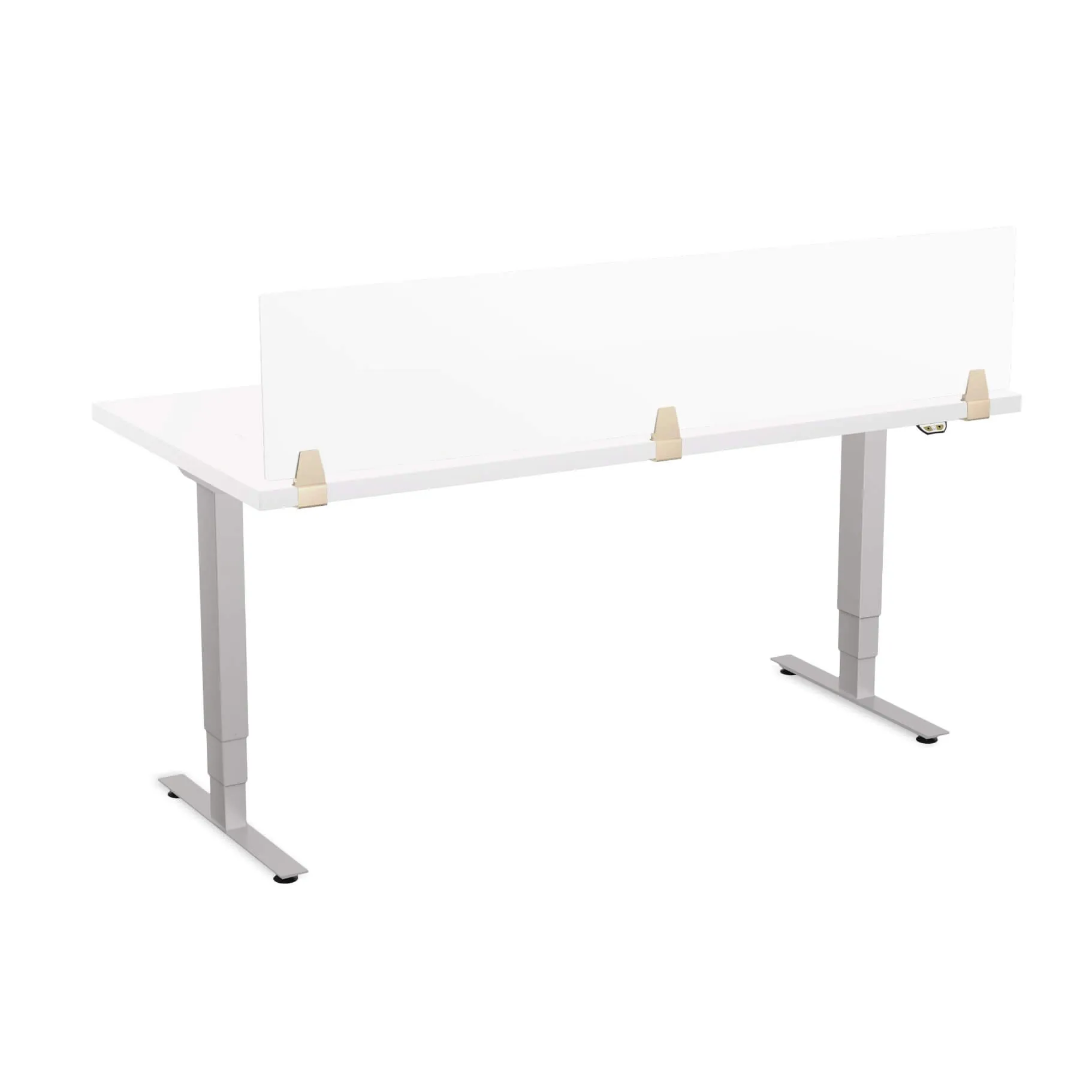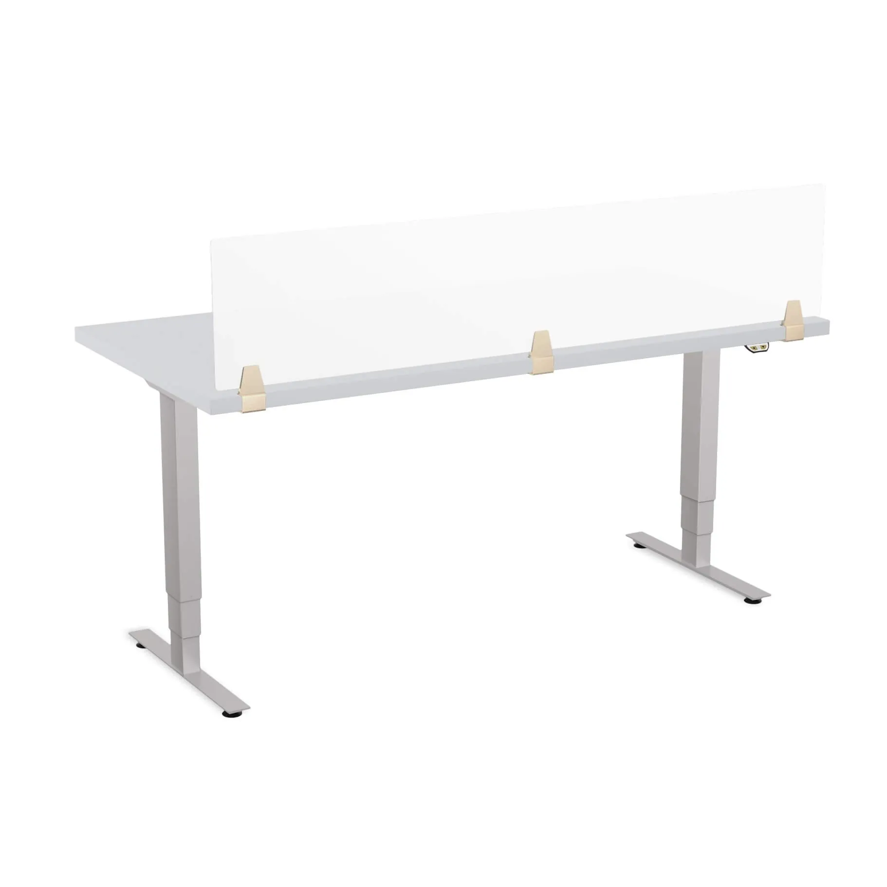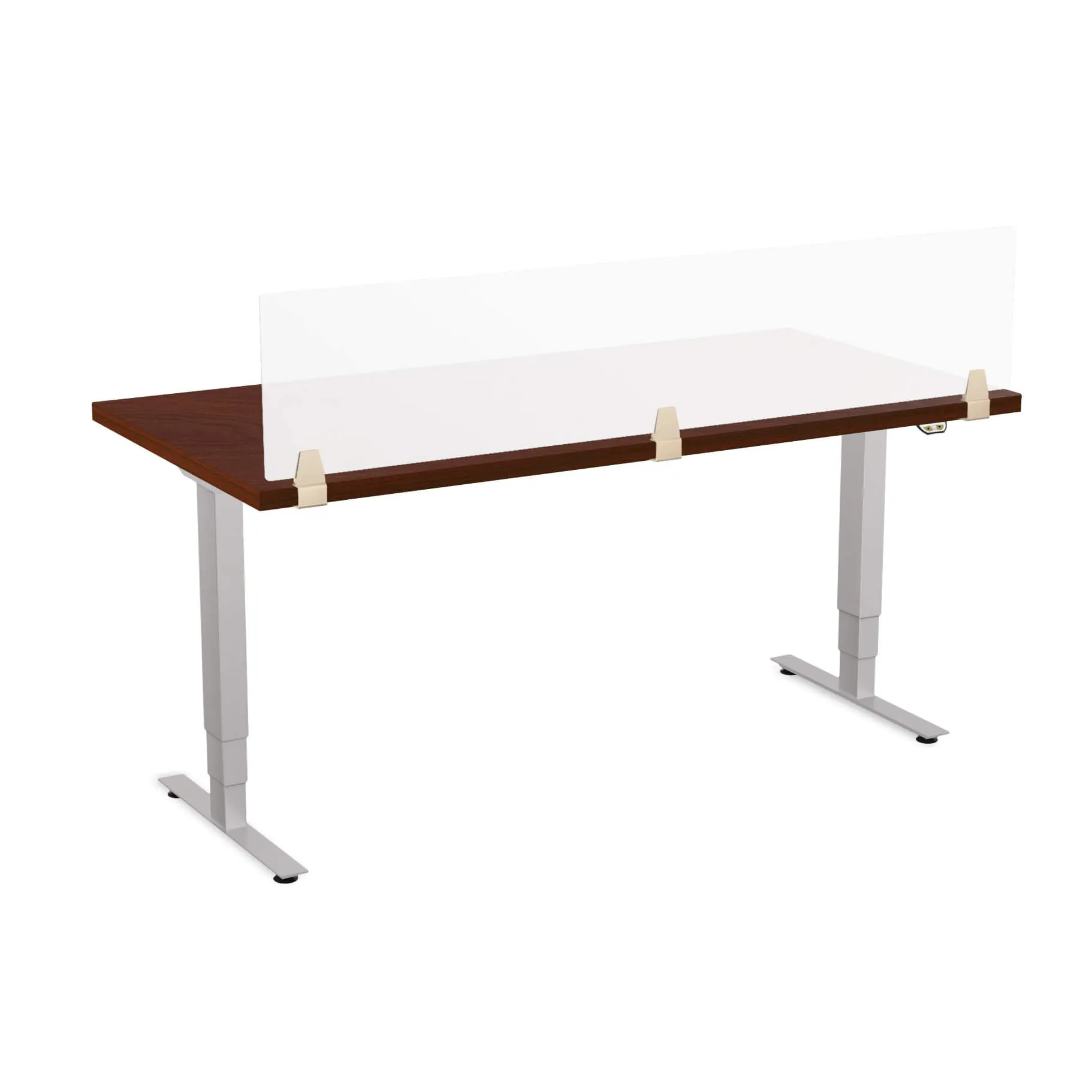 This sit stand desk features low pressure laminate surface with 3mm PVC edge and legs in a metallic silver finish. The privacy panel is made of frosted acrylic. The work surface is available in five colors: Light Grey, White, Cherry, Mahogany and Espresso.