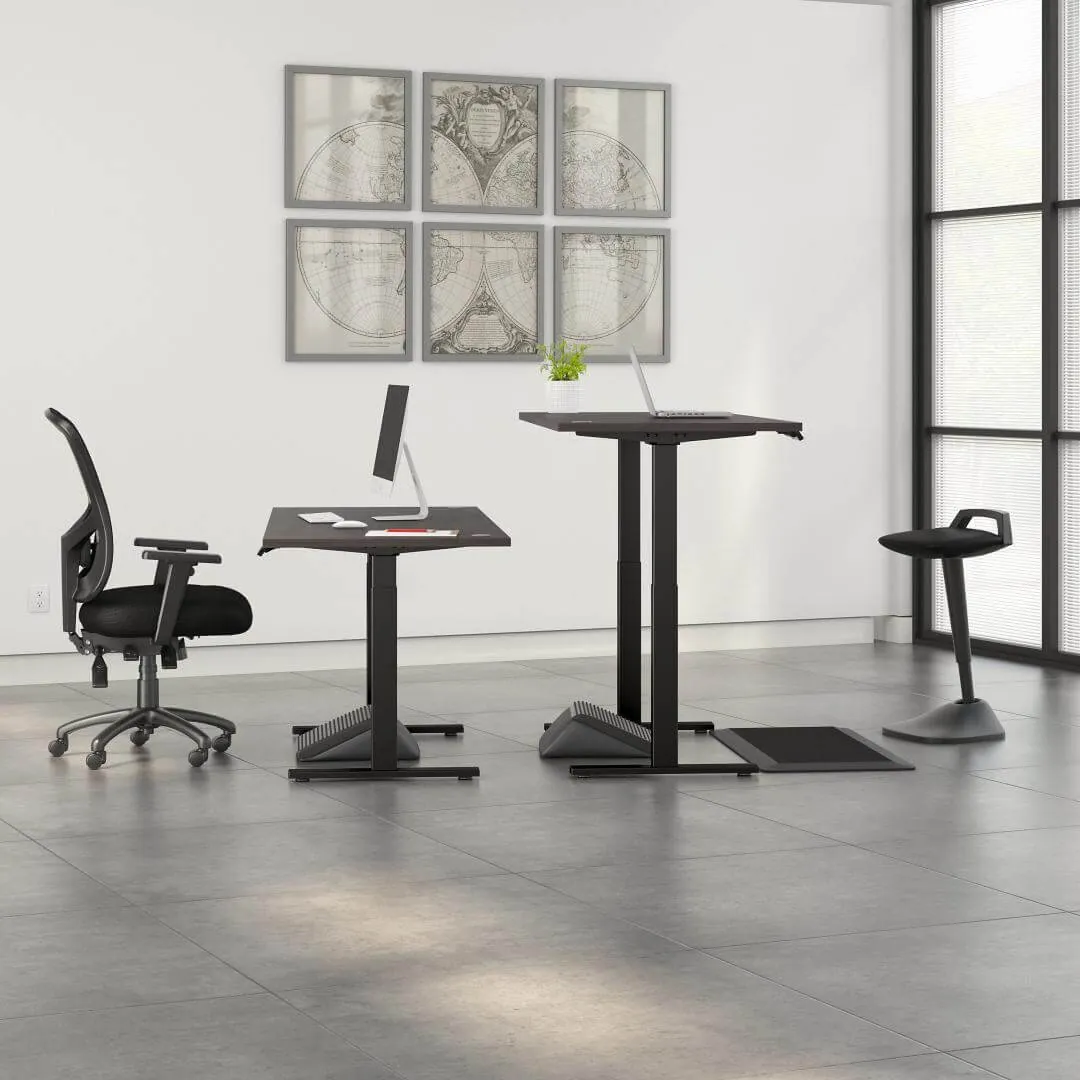 Most savvy shoppers choose a motorized sit stand desk that is electricaly powered, over the manual pneumatic or hand-crank options available on the market. An electric style sit and stand computer desk offers greater convenience, more control, and better accuracy for reaching the precise heights that are optimal for ergonomic benefits – especially this model, which comes with programmable memory buttons. Electric style desks are also comparable in price ranges to the manual counterparts (sometimes even cheaper!). All they ask in return is an available nearby power outlet.