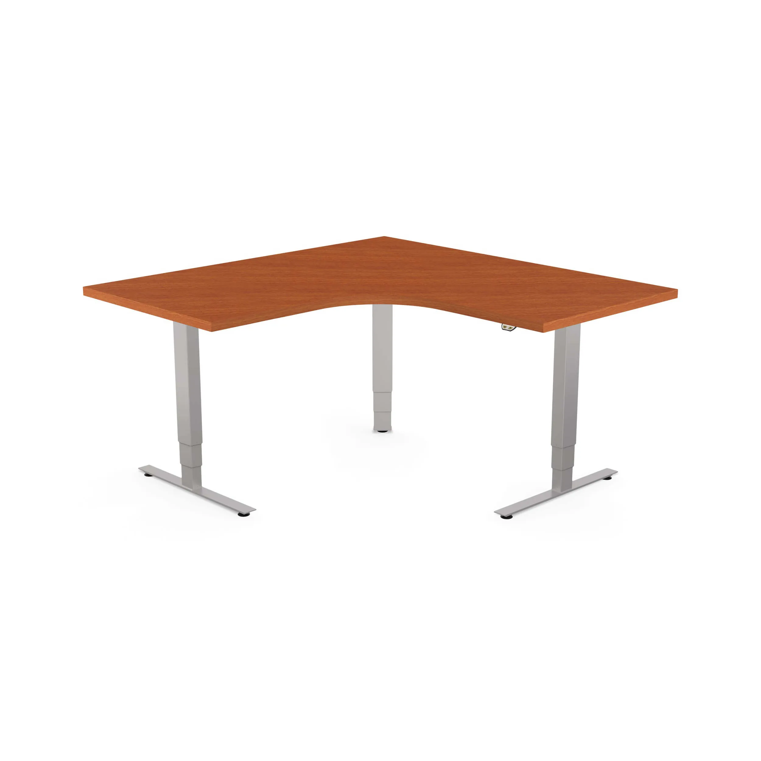 This sit stand desk features T-Legs with metallic silver finish. The laminate work surface has a 3mm Vinyl edge and is available in four colors: Wild Cherry, Kensington Maple, River Cherry and Brazilwood.
