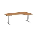 This sit stand desk features T-Legs with metallic silver finish. The laminate work surface has a 3mm Vinyl edge and is available in four colors: Wild Cherry, Kensington Maple, River Cherry and Brazilwood.