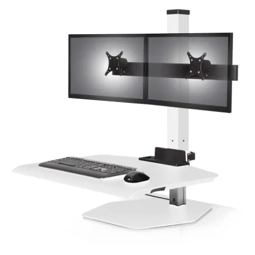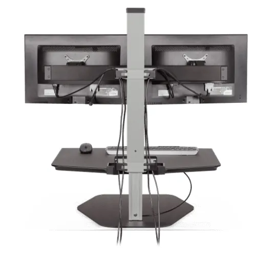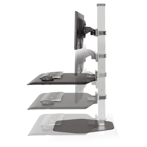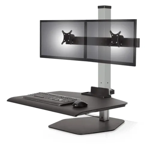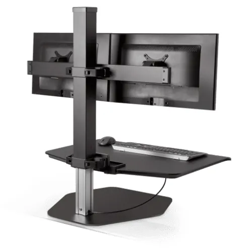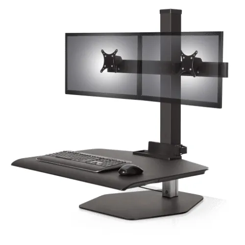 A sit stand desk converter is a great solution if you want to benefit from sit stand functionality but don’t want to get rid of your existing desk furniture. Relatively lightweight and portable, a desktop riser sits right on top of your desk surface and can raise or lower to your desired position, keeping your computer monitors, keyboard, mouse, and other important accessories right at your fingertips.
