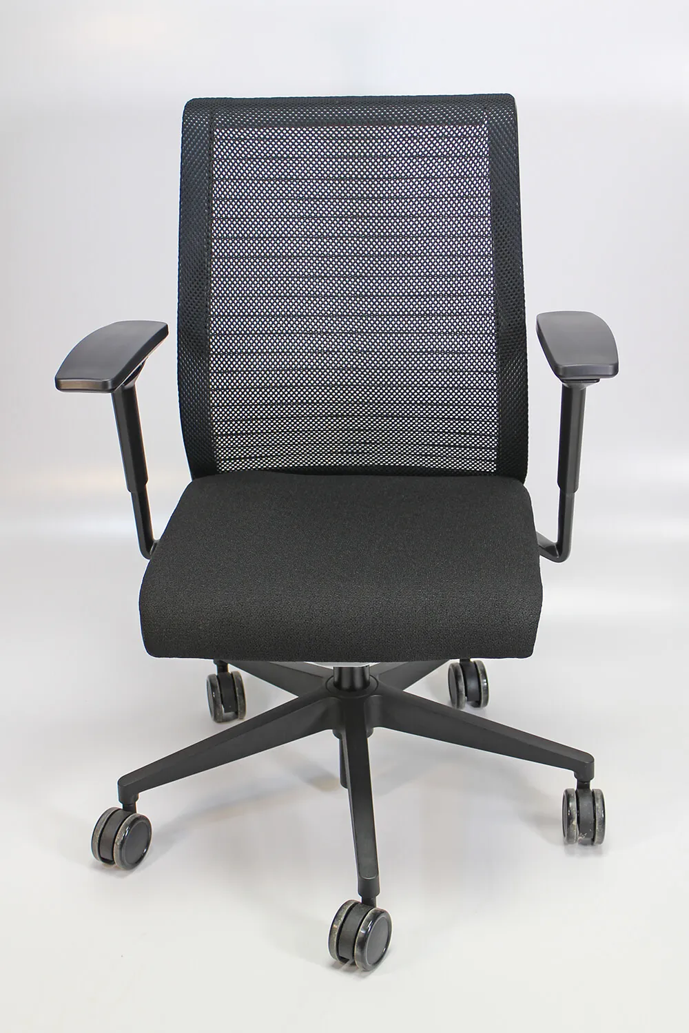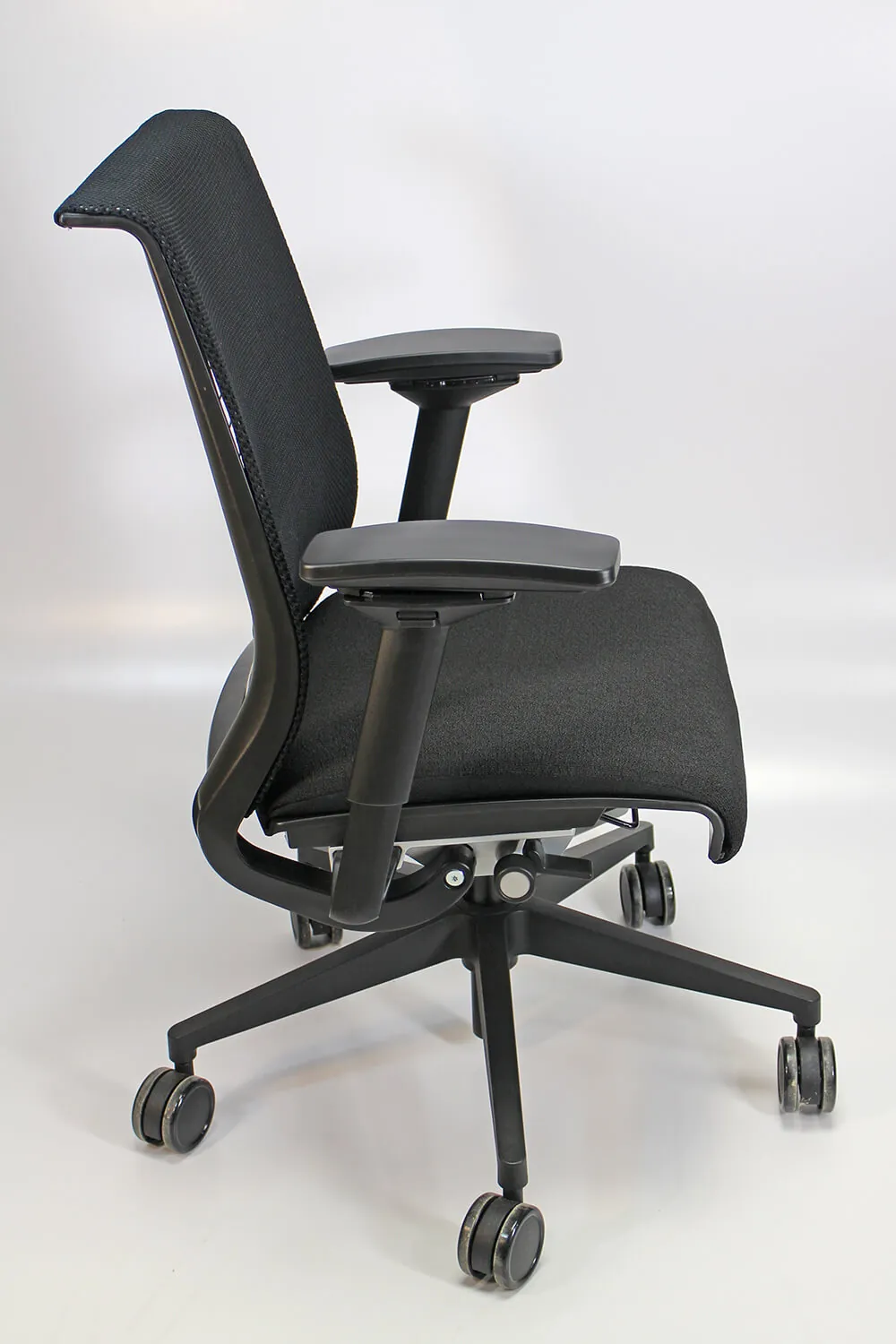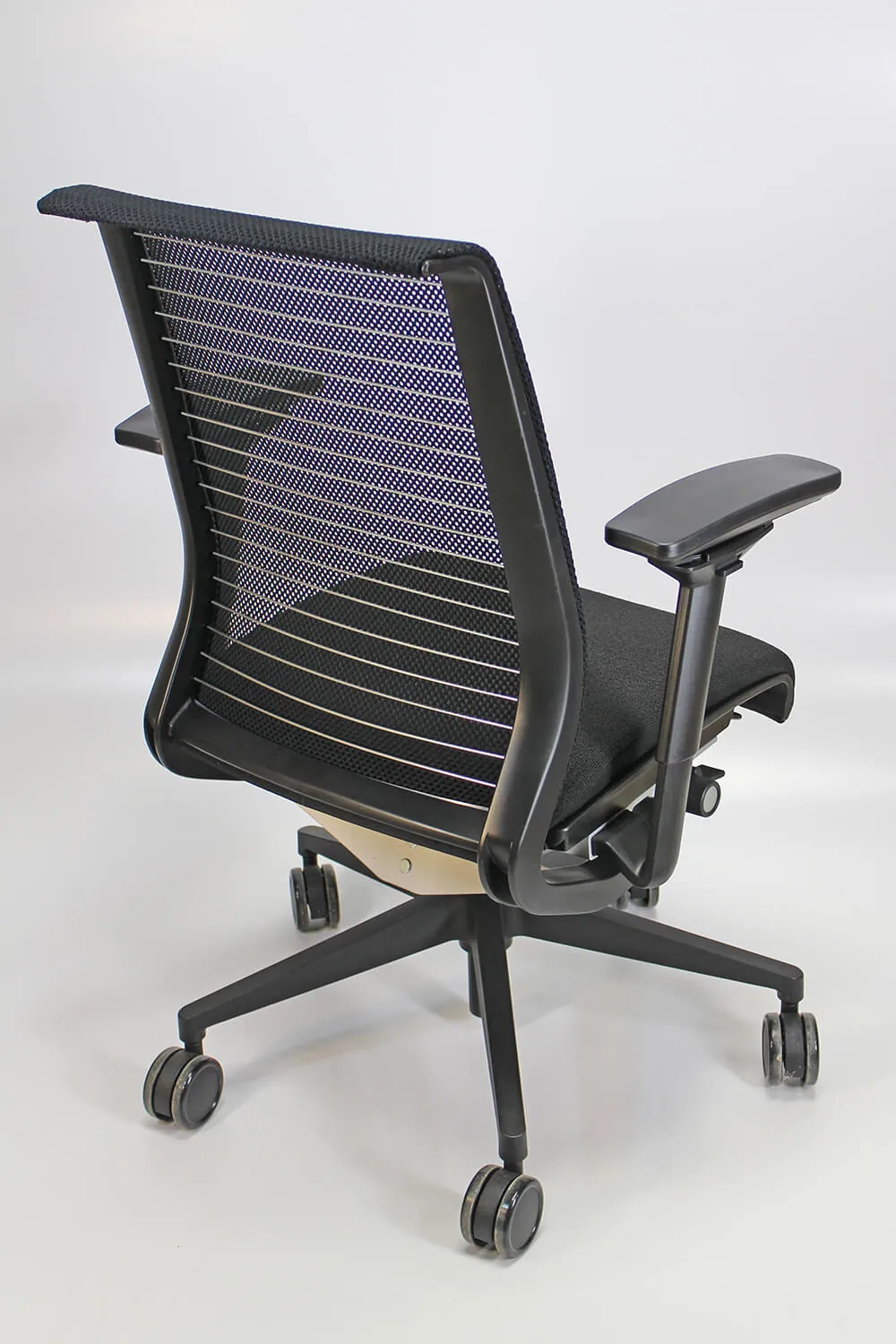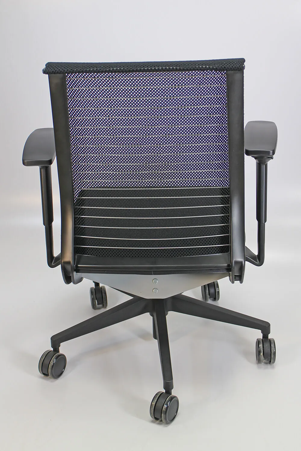 Steelcase's reputation for innovation in design and technology takes another step further with the elegant and convenient Steelcase Think chair. Sit and recline in comfort while the back and seat track your movement and shape to adjust to your body for optimal support in every area of your spine. The flexible seat edge relieves the static pressure on your legs, from prolonged use, when you recline or lean forward. All this combines with the adjustable arms to make this beautiful piece of office seating furniture one of the most intuitive chairs on the market today.