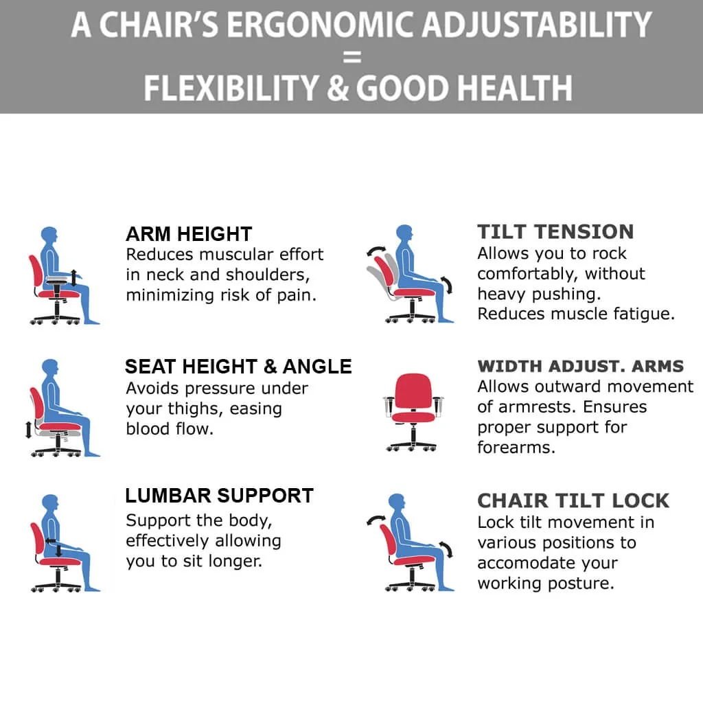 Standard features include: Arms Height and Width adjustment, Seat Height and Angle Adjustment, Tension knob, Tilt Lock.